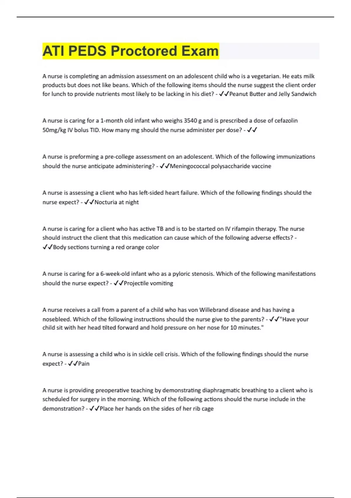 ATI PEDS Proctored Exam| Questions with 100% Correct Answers | Verified