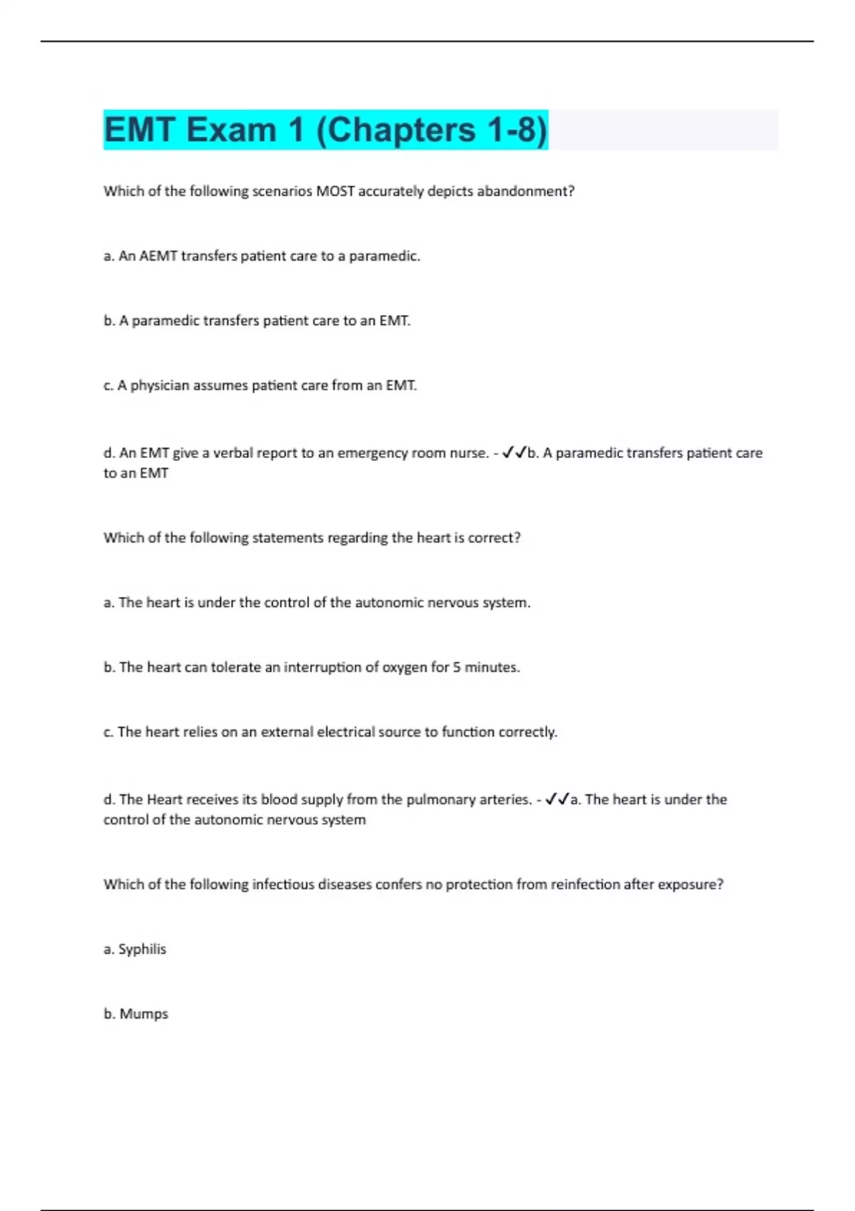 Which of the following scenarios MOST accurately depicts abandonment? a. An AEMT transfers patient care to a paramedic. b. A paramedic transfers patient care to an EMT. c. A physician assumes patient care from an EMT. d. An EMT give a verbal report to an emergency room nurse. - b. A paramedic transfers patient care to an EMT Which of the following statements regarding the heart is correct? a. The heart is under the control of the autonomic nervous system. b. The heart can tolerate an interruption of oxygen for 5 minutes. c. The heart relies on an external electrical source to function correctly. d. The Heart receives its blood supply from the pulmonary arteries. - a. The heart is under the control of the autonomic nervous system Which of the following infectious diseases confers no protection from reinfection after exposure? a. Syphilis b. Mumps