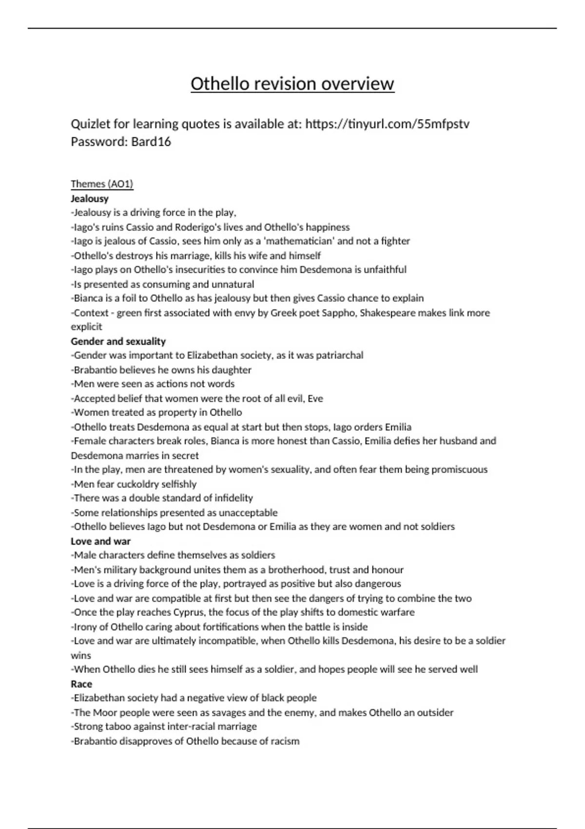 A complete summary of Shakespeare's Othello for the A-level exam, explaining how to meet each AO as well as a comprehensive guide to the text. The document also includes a list of useful quotes, with an accompanying link to Quizlet flashcards to help you learn them for the exam.