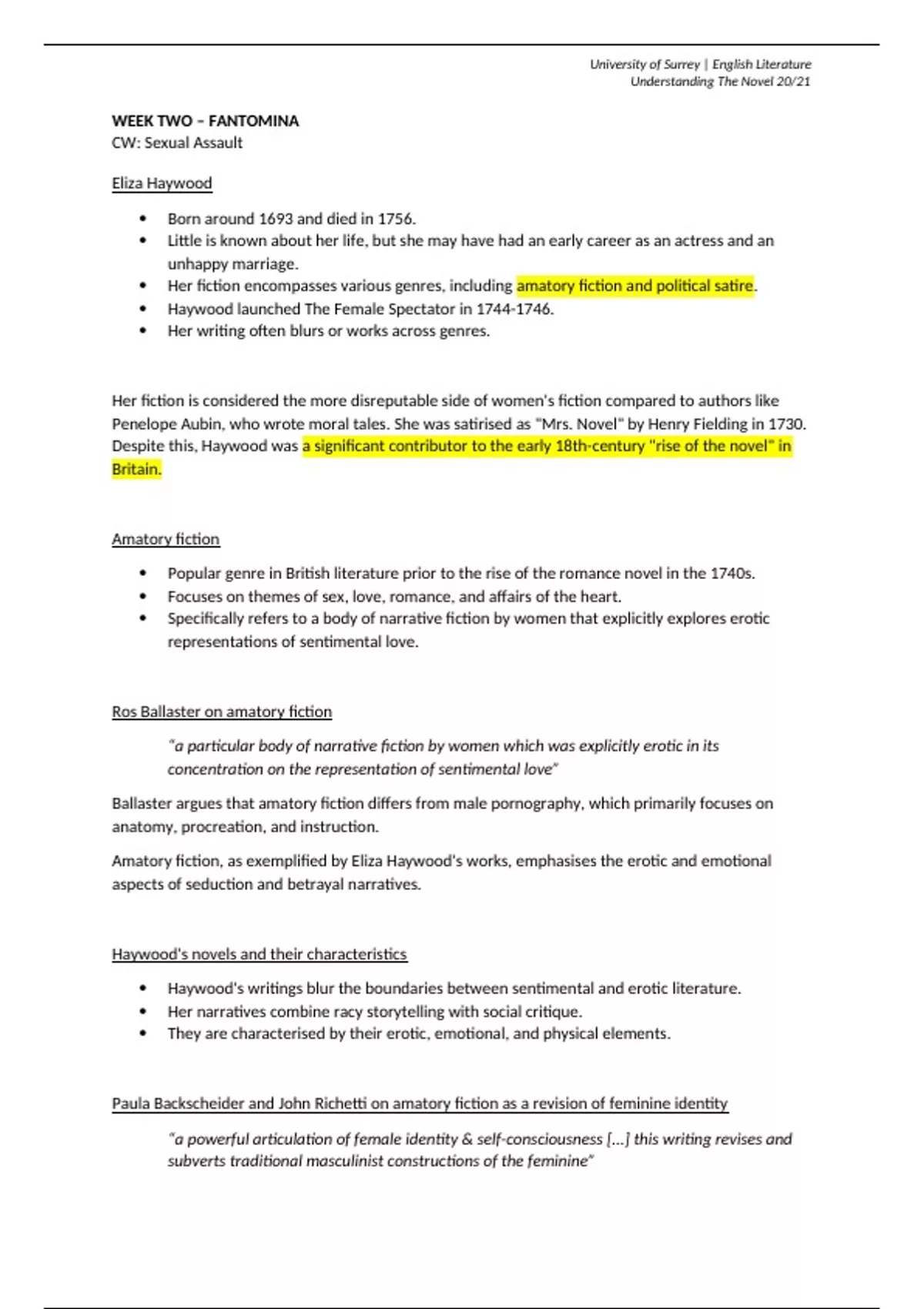 Week 2 of Understanding the Novel Learn about one of the key authors for the rise of the novel in England, Eliza Haywood, and her controversial book Fantomina. Check out my store for more lecture notes for English lit!