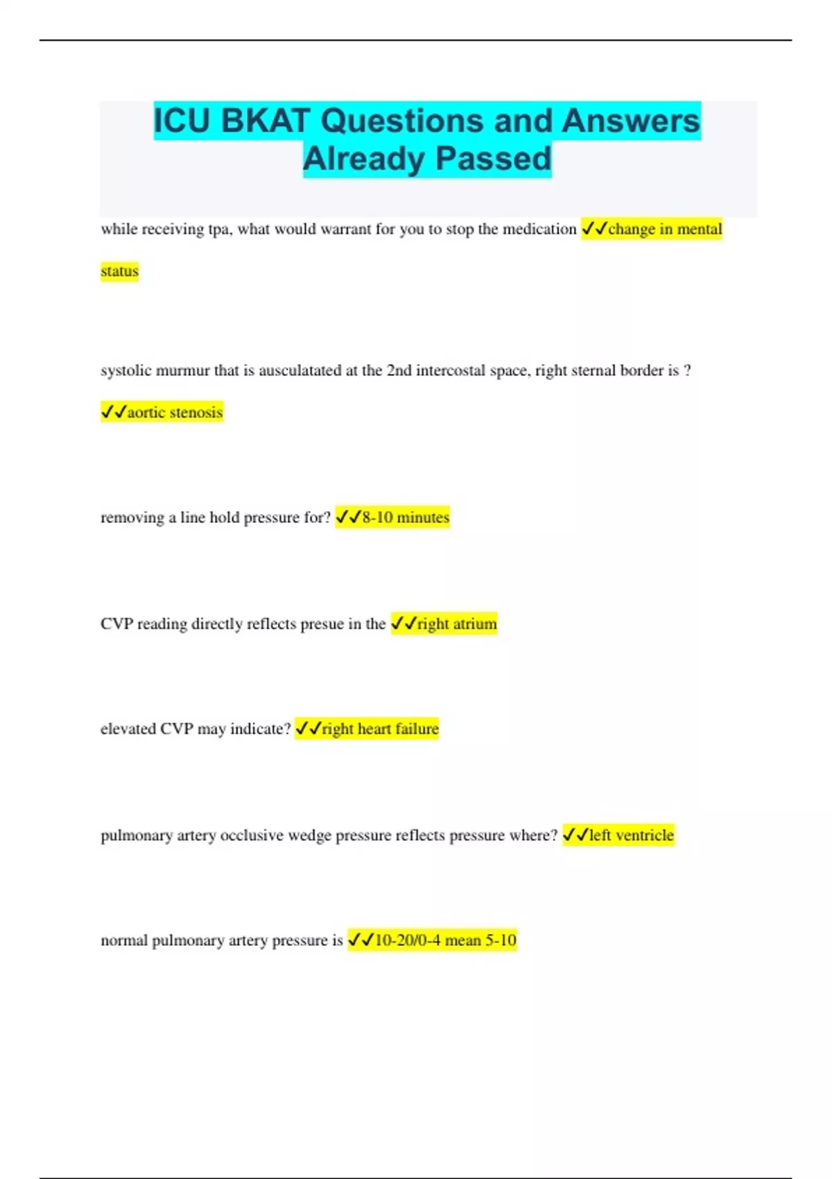 ICU BKAT Questions and Answers Already Passed