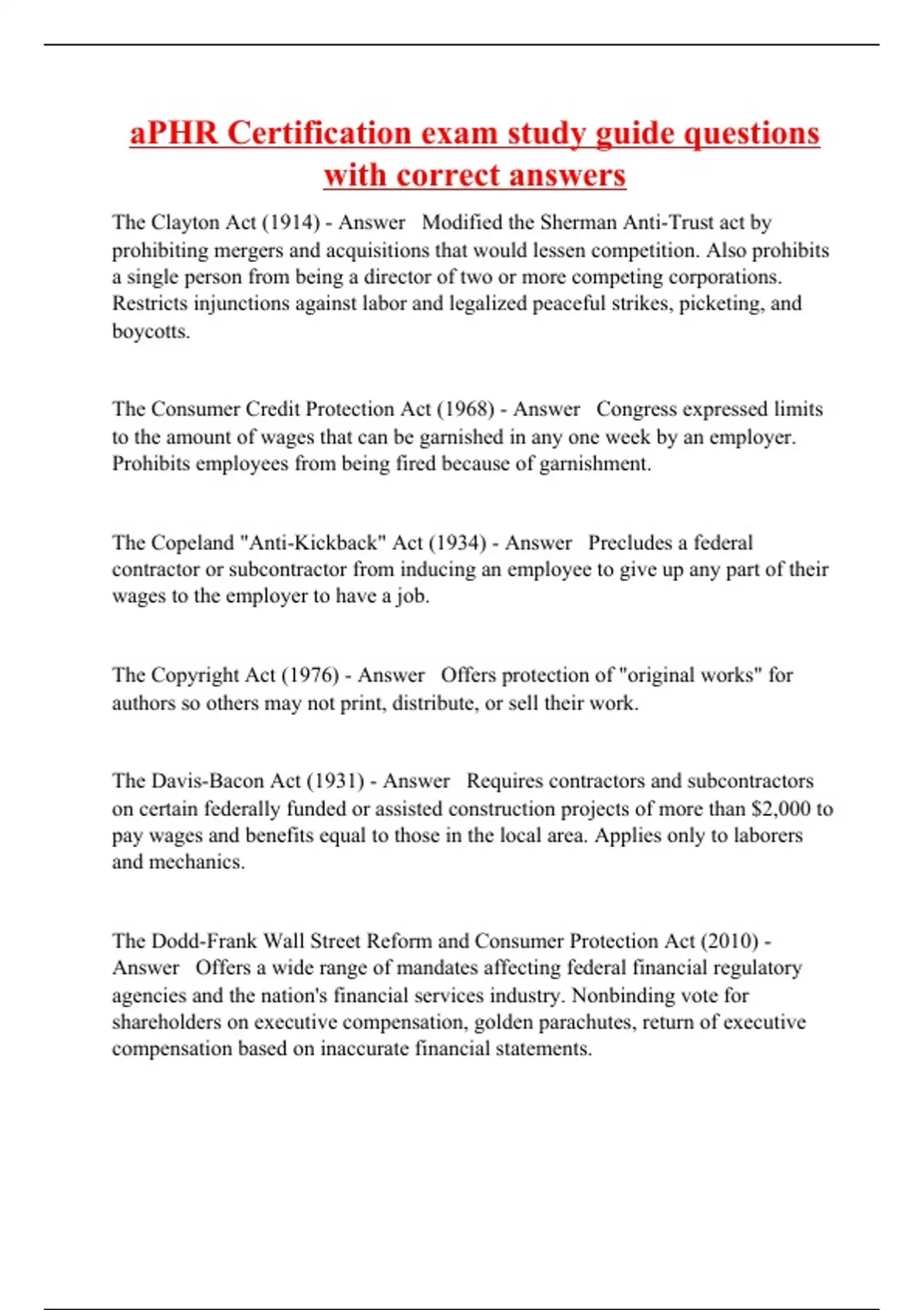The Clayton Act (1914) - Answer Modified the Sherman Anti-Trust act by prohibiting mergers and acquisitions that would lessen competition. Also prohibits a single person from being a director of two or more competing corporations. Restricts injunctions against labor and legalized peaceful strikes, picketing, and boycotts. The Consumer Credit Protection Act (1968) - Answer Congress expressed limits to the amount of wages that can be garnished in any one week by an employer. Prohibits employees from being fired because of garnishment. The Copeland "Anti-Kickback" Act (1934) - Answer Precludes a federal contractor or subcontractor from inducing an employee to give up any part of their wages to the employer to have a job. The Copyright Act (1976) - Answer Offers protection of "original works" for authors so others may not print, distribute, or sell their work. The Davis-Bacon Act (1931) - Answer Requires contractors and subcontractors on certain federally funded or assisted construction projects of more than $2,000 to pay wages and benefits equal to those in the local area. Applies only to laborers and mechanics. The Dodd-Frank Wall Street Reform and Consumer Protection Act (2010) - Answer Offers a wide range of mandates affecting federal financial regulatory agencies and the nation's financial services industry. Nonbinding vote for shareholders on executive compensation, golden parachutes, return of executive compensation based on inaccurate financial statements.