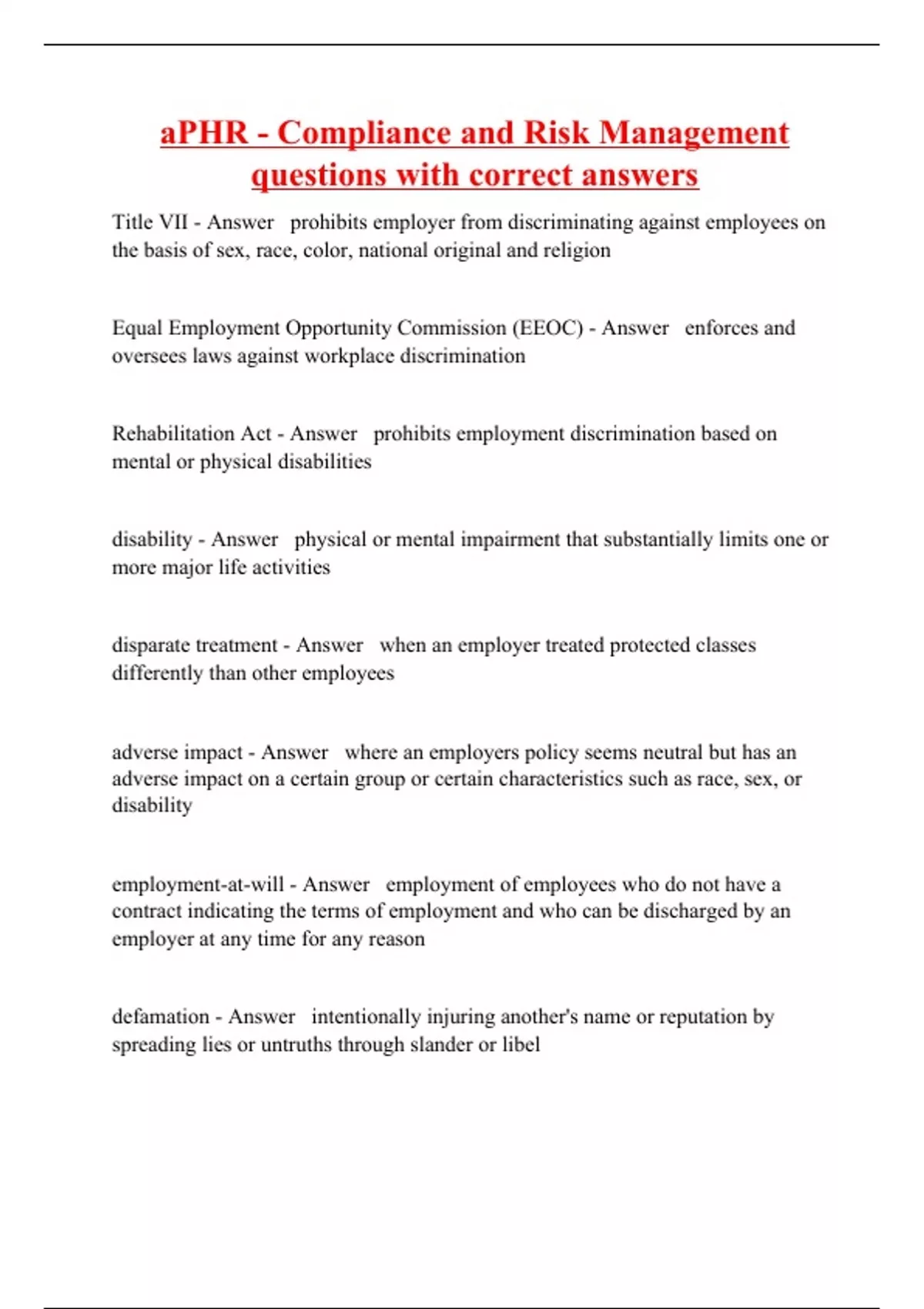 Title VII - Answer prohibits employer from discriminating against employees on the basis of sex, race, color, national original and religion Equal Employment Opportunity Commission (EEOC) - Answer enforces and oversees laws against workplace discrimination Rehabilitation Act - Answer prohibits employment discrimination based on mental or physical disabilities disability - Answer physical or mental impairment that substantially limits one or more major life activities disparate treatment - Answer when an employer treated protected classes differently than other employees adverse impact - Answer where an employers policy seems neutral but has an adverse impact on a certain group or certain characteristics such as race, sex, or disability employment-at-will - Answer employment of employees who do not have a contract indicating the terms of employment and who can be discharged by an employer at any time for any reason defamation - Answer intentionally injuring another's name or reputation by spreading lies or untruths through slander or libel