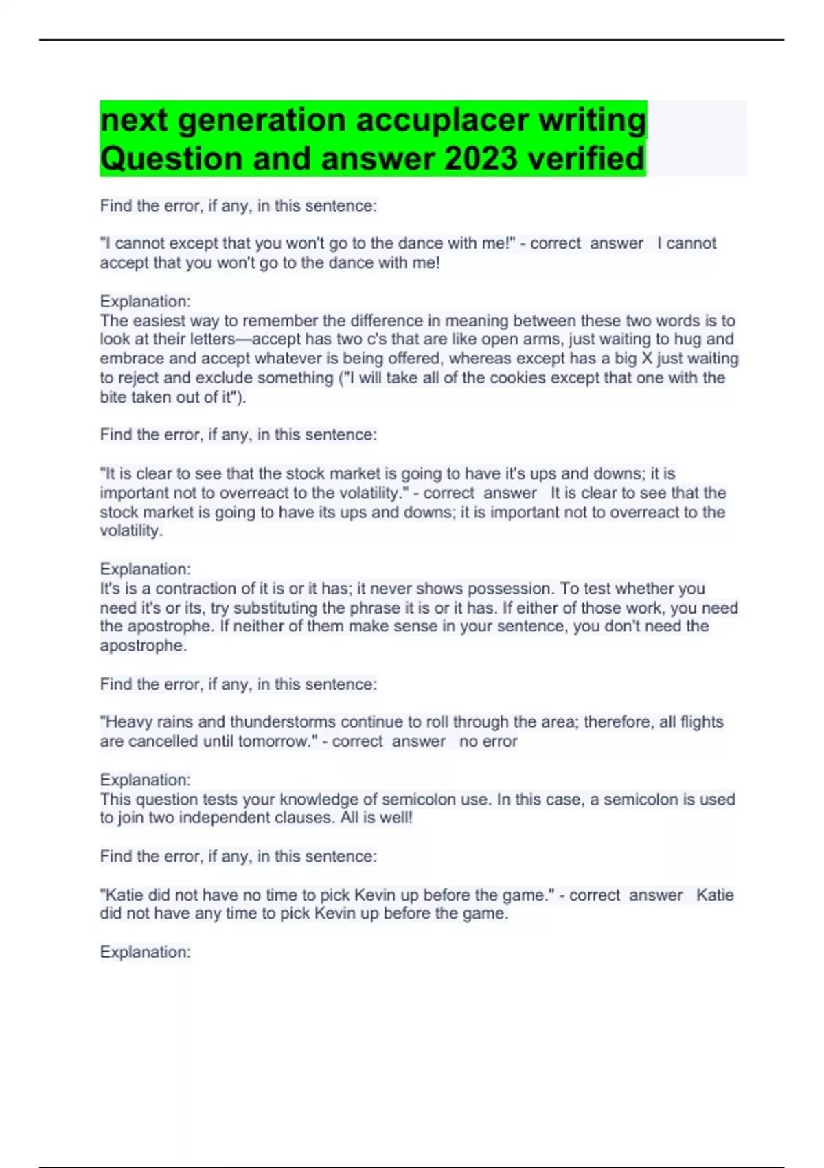 next generation accuplacer writing Question and answer 2023 verified Find the error, if any, in this sentence: "I cannot except that you won't go to the dance with me!" I cannot accept that you won't go to the dance with me! Explanation: The easiest way to remember the difference in meaning between these two words is to look at their letters—accept has two c's that are like open arms, just waiting to hug and embrace and accept whatever is being offered, whereas except has a big X just waiting to reject and exclude something ("I will take all of the cookies except that one with the bite taken out of it"). Find the error, if any, in this sentence: "It is clear to see that the stock market is going to have it's ups and downs; it is important not to overreact to the volatility." It is clear to see that the stock market is going to have its ups and downs; it is important not to overreact to the volatility. Explanation: It's is a contraction of it is or it has; it never shows possession. To test whether you need it's or its, try substituting the phrase it is or it has. If either of those work, you need the apostrophe. If neither of them make sense in your sentence, you don't need the apostrophe. Find the error, if any, in this sentence: "Heavy rains and thunderstorms continue to roll through the area; therefore, all flights are cancelled until tomorrow." no error Explanation: This question tests your knowledge of semicolon use. In this case, a semicolon is used to join two independent clauses. All is well! Find the error, if any, in this sentence: "Katie did not have no time to pick Kevin up before the game." Katie did not have any time to pick Kevin up before the game. Explanation: This sentence had a double negative, which is a big no-no. Just like in math, double negatives actually create a positive, which was not the intent of the sentence. Find the error, if any, in this sentence: "The wily fox escape the dogs who were chasing after it." The wily fox escaped the dogs who were chasing after it. Explanation: The verbs need to match in subject and tense. In this case, the first verb, escape, did not match its subject in number (fox = singular, escape = plural) and it did not match the other verbs in tense (escape = present tense, were chasing = past tense). Find the error, if any, in this sentence: "The book was thrown on the bed by Madi." No error, but the sentence would be stronger if written in active voice: "Madi threw the book on the bed." Explanation: Remember, while not grammatically incorrect, sentences written in passive voice can create weak, ineffectual writing. Try to always use active voice so that instead of the subject of the sentence being a victim of whatever action is being done, it can be the doer. Find the error, if any, in this sentence: "The piano keys was broken." The piano keys were broken. Explanation: This is a subject-verb agreement issue. The word keys is plural, but was is singular. It would be correct to say, "The piano key was broken." Find the error, if any, in this sentence: "The DVD's were on sale for $5 each." The DVDs were on sale for $5 each. Explanation: Remember, apostrophes are for contractions or possession only. There shouldn't be an apostrophe to pluralize acronyms or abbreviations (nor should you use them in dates—it was the 1970s, not the 1970's). Find the error, if any, in this sentence: "We visited Barcelona, Spain; Marseille, France; Rome, Italy; and Athens, Greece on our European cruise." no error Explanation: Although it may seem like a lot of semicolons in one sentence, they are all necessary to separate the list of locations. In this case, the commas separate the city from the country and the semicolons separate those four locations. Find the error, if any, in this sentence: "On the advise of my lawyer, I refuse to answer that question." On the advice of my lawyer, I refuse to answer that question. Explanation: Advice and advise are often confused. Advice is a noun, a recommendation about what to do. Advise is a verb, to recommend something. They cannot be used interchangeably. To know which one to use, determine which part of speech the word is in a sentence. If it is acting as a noun (a "something"), use advice; if it is acting as a verb (something someone is doing), use advise. Find the error, if any, in this sentence: "Mom was sure Brian would loose his wallet if he kept it in his pocket while skateboarding." Mom was sure Brian would lose his wallet if he kept it in his pocket while skateboarding. Explanation: One o makes a big difference. In the case of lose vs. loose, loose means to unfasten or set free (Mark got the turtle loose from the plastic noose.). But, lose one "o" and now you've changed the word to mean being deprived of or unable to find something. Remember, you lose one o and you get a satisfying "oo" when you loosen your tight belt.