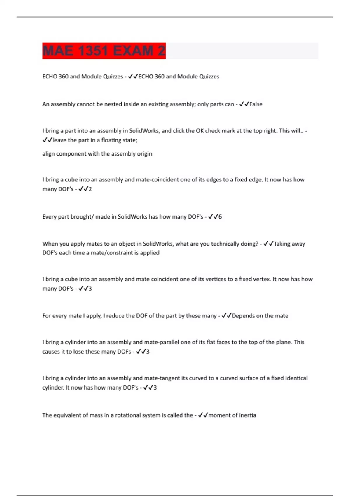 ECHO 360 and Module Quizzes - ECHO 360 and Module Quizzes An assembly cannot be nested inside an existing assembly; only parts can - False I bring a part into an assembly in SolidWorks, and click the OK check mark at the top right. This will.. - leave the part in a floating state; align component with the assembly origin I bring a cube into an assembly and mate-coincident one of its edges to a fixed edge. It now has how many DOF's - 2 Every part brought/ made in SolidWorks has how many DOF's - 6 When you apply mates to an object in SolidWorks, what are you technically doing? - Taking away DOF's each time a mate/constraint is applied I bring a cube into an assembly and mate coincident one of its vertices to a fixed vertex. It now has how many DOF's - 3 For every mate I apply, I reduce the DOF of the part by these many - Depends on the mate I bring a cylinder into an assembly and mate-parallel one of its flat faces to the top of the plane. This causes it to lose these many DOFs - 3 I bring a cylinder into an assembly and mate-tangent its curved to a curved surface of a fixed identical cylinder. It now has how many DOF's - 3 The equivalent of mass in a rotational system is called the - moment of inertia