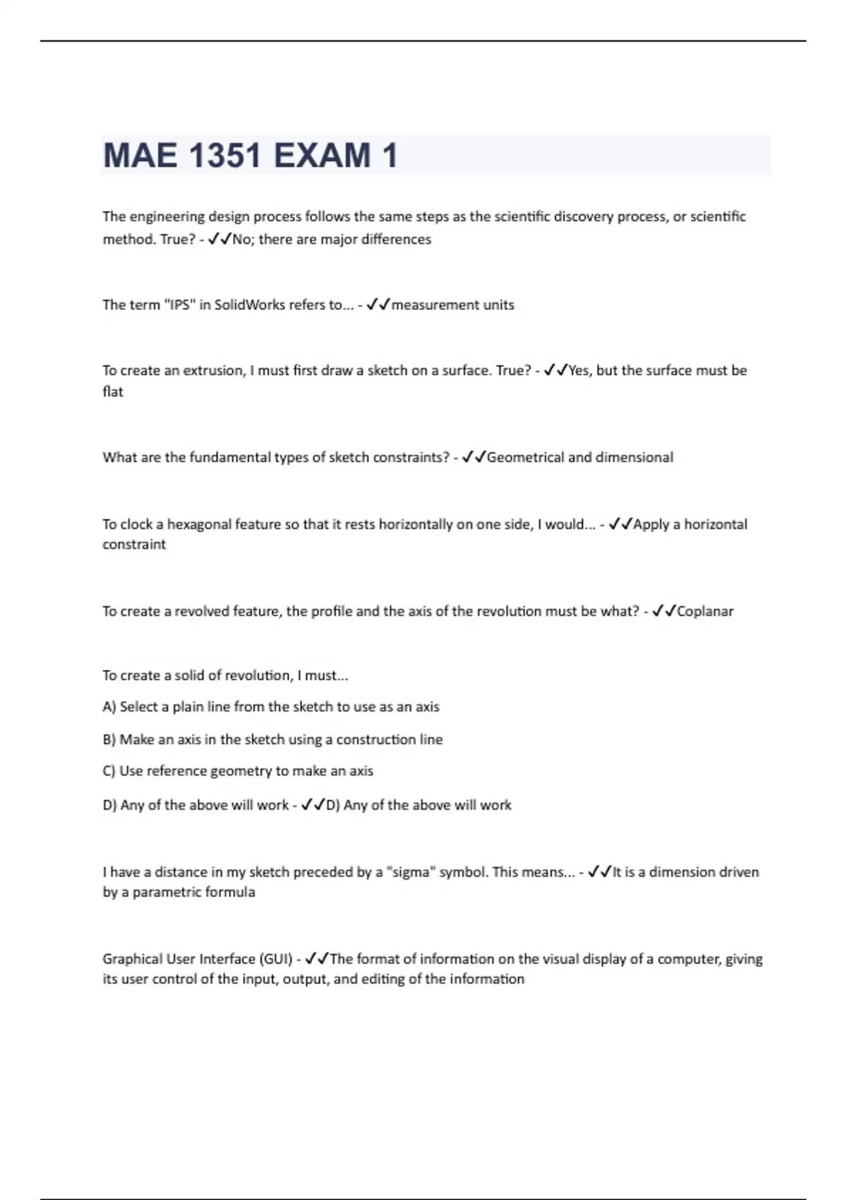 The engineering design process follows the same steps as the scientific discovery process, or scientific method. True? - No; there are major differences The term "IPS" in SolidWorks refers to... - measurement units To create an extrusion, I must first draw a sketch on a surface. True? - Yes, but the surface must be flat What are the fundamental types of sketch constraints? - Geometrical and dimensional To clock a hexagonal feature so that it rests horizontally on one side, I would... - Apply a horizontal constraint To create a revolved feature, the profile and the axis of the revolution must be what? - Coplanar To create a solid of revolution, I must... A) Select a plain line from the sketch to use as an axis B) Make an axis in the sketch using a construction line C) Use reference geometry to make an axis D) Any of the above will work - D) Any of the above will work I have a distance in my sketch preceded by a "sigma" symbol. This means... - It is a dimension driven by a parametric formula Graphical User Interface (GUI) - The format of information on the visual display of a computer, giving its user control of the input, output, and editing of the information