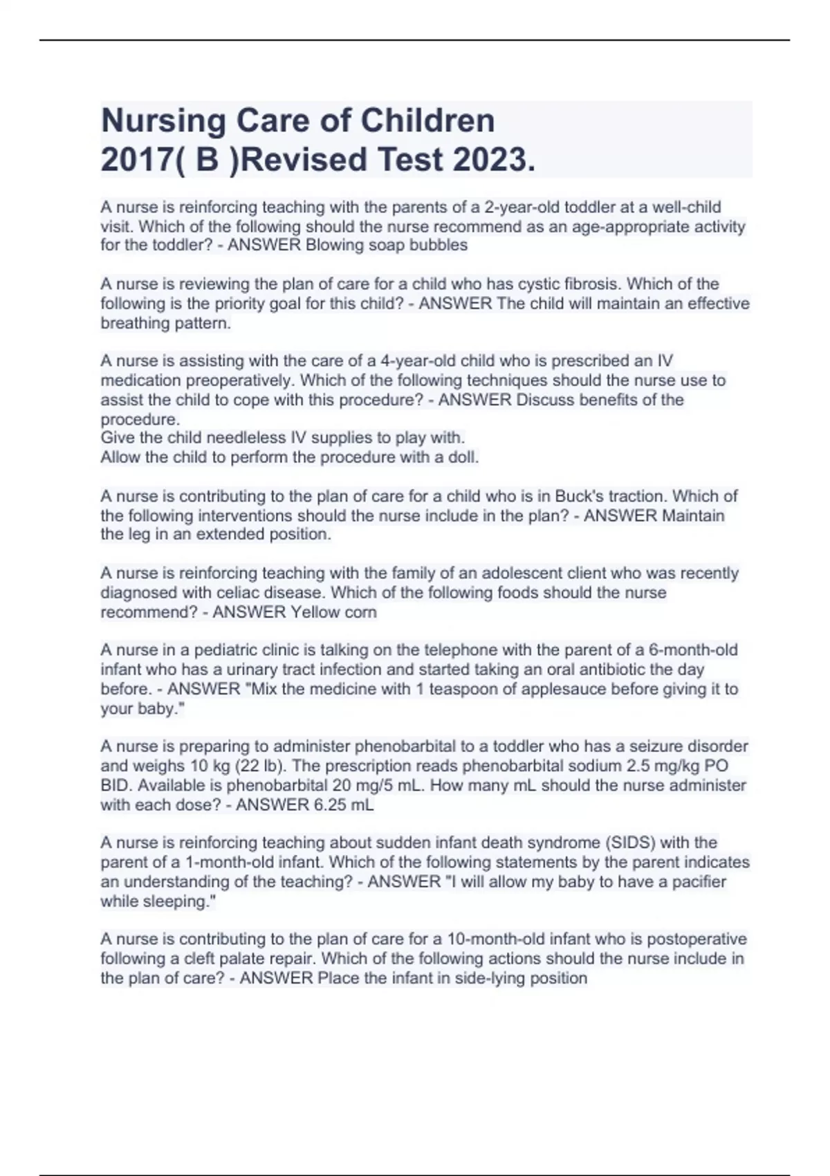 Nursing Care of Children 2017( B )Revised Test 2023.A nurse is reinforcing teaching with the parents of a 2-year-old toddler at a well-child visit. Which of the following should the nurse recommend as an age-appropriate activity for the toddler? - ANSWER Blowing soap bubbles A nurse is reviewing the plan of care for a child who has cystic fibrosis. Which of the following is the priority goal for this child? - ANSWER The child will maintain an effective breathing pattern. A nurse is assisting with the care of a 4-year-old child who is prescribed an IV medication preoperatively. Which of the following techniques should the nurse use to assist the child to cope with this procedure? - ANSWER Discuss benefits of the procedure. Give the child needleless IV supplies to play with. Allow the child to perform the procedure with a doll. A nurse is contributing to the plan of care for a child who is in Buck's traction. Which of the following interventions should the nurse include in the plan? - ANSWER Maintain the leg in an extended position. A nurse is reinforcing teaching with the family of an adolescent client who was recently diagnosed with celiac disease. Which of the following foods should the nurse recommend? - ANSWER Yellow corn A nurse in a pediatric clinic is talking on the telephone with the parent of a 6-month-old infant who has a urinary tract infection and started taking an oral antibiotic the day before. - ANSWER "Mix the medicine with 1 teaspoon of applesauce before giving it to your baby." A nurse is preparing to administer phenobarbital to a toddler who has a seizure disorder and weighs 10 kg (22 lb). The prescription reads phenobarbital sodium 2.5 mg/kg PO BID. Available is phenobarbital 20 mg/5 mL. How many mL should the nurse administer with each dose? - ANSWER 6.25 mL A nurse is reinforcing teaching about sudden infant death syndrome (SIDS) with the parent of a 1-month-old infant. Which of the following statements by the parent indicates an understanding of the teaching? - ANSWER "I will allow my baby to have a pacifier while sleeping." A nurse is contributing to the plan of care for a 10-month-old infant who is postoperative following a cleft palate repair. Which of the following actions should the nurse include in the plan of care? - ANSWER Place the infant in side-lying position