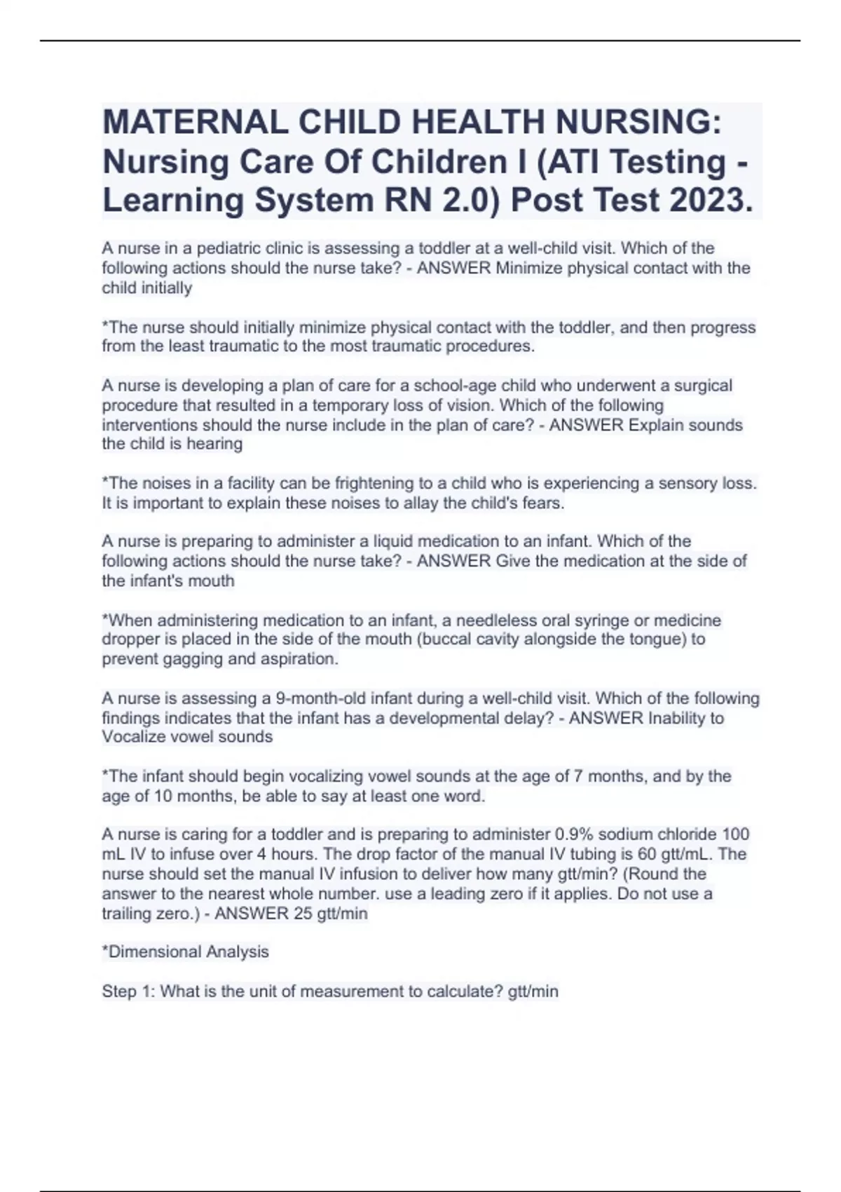 MATERNAL CHILD HEALTH NURSING: Nursing Care Of Children I (ATI Testing - Learning System RN 2.0) Post Test 2023. A nurse in a pediatric clinic is assessing a toddler at a well-child visit. Which of the following actions should the nurse take? - ANSWER Minimize physical contact with the child initially *The nurse should initially minimize physical contact with the toddler, and then progress from the least traumatic to the most traumatic procedures. A nurse is developing a plan of care for a school-age child who underwent a surgical procedure that resulted in a temporary loss of vision. Which of the following interventions should the nurse include in the plan of care? - ANSWER Explain sounds the child is hearing *The noises in a facility can be frightening to a child who is experiencing a sensory loss. It is important to explain these noises to allay the child's fears. A nurse is preparing to administer a liquid medication to an infant. Which of the following actions should the nurse take? - ANSWER Give the medication at the side of the infant's mouth *When administering medication to an infant, a needleless oral syringe or medicine dropper is placed in the side of the mouth (buccal cavity alongside the tongue) to prevent gagging and aspiration. A nurse is assessing a 9-month-old infant during a well-child visit. Which of the following findings indicates that the infant has a developmental delay? - ANSWER Inability to Vocalize vowel sounds *The infant should begin vocalizing vowel sounds at the age of 7 months, and by the age of 10 months, be able to say at least one word. A nurse is caring for a toddler and is preparing to administer 0.9% sodium chloride 100 mL IV to infuse over 4 hours. The drop factor of the manual IV tubing is 60 gtt/mL. The nurse should set the manual IV infusion to deliver how many gtt/min? (Round the answer to the nearest whole number. use a leading zero if it applies. Do not use a trailing zero.) - ANSWER 25 gtt/min *Dimensional Analysis Step 1: What is the unit of measurement to calculatne? gtt/mi