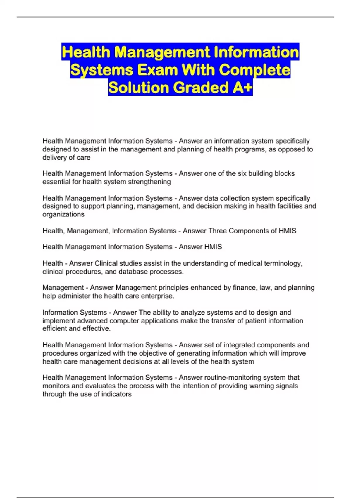 Health Management Information Systems Exam With Complete Solution Graded A+...