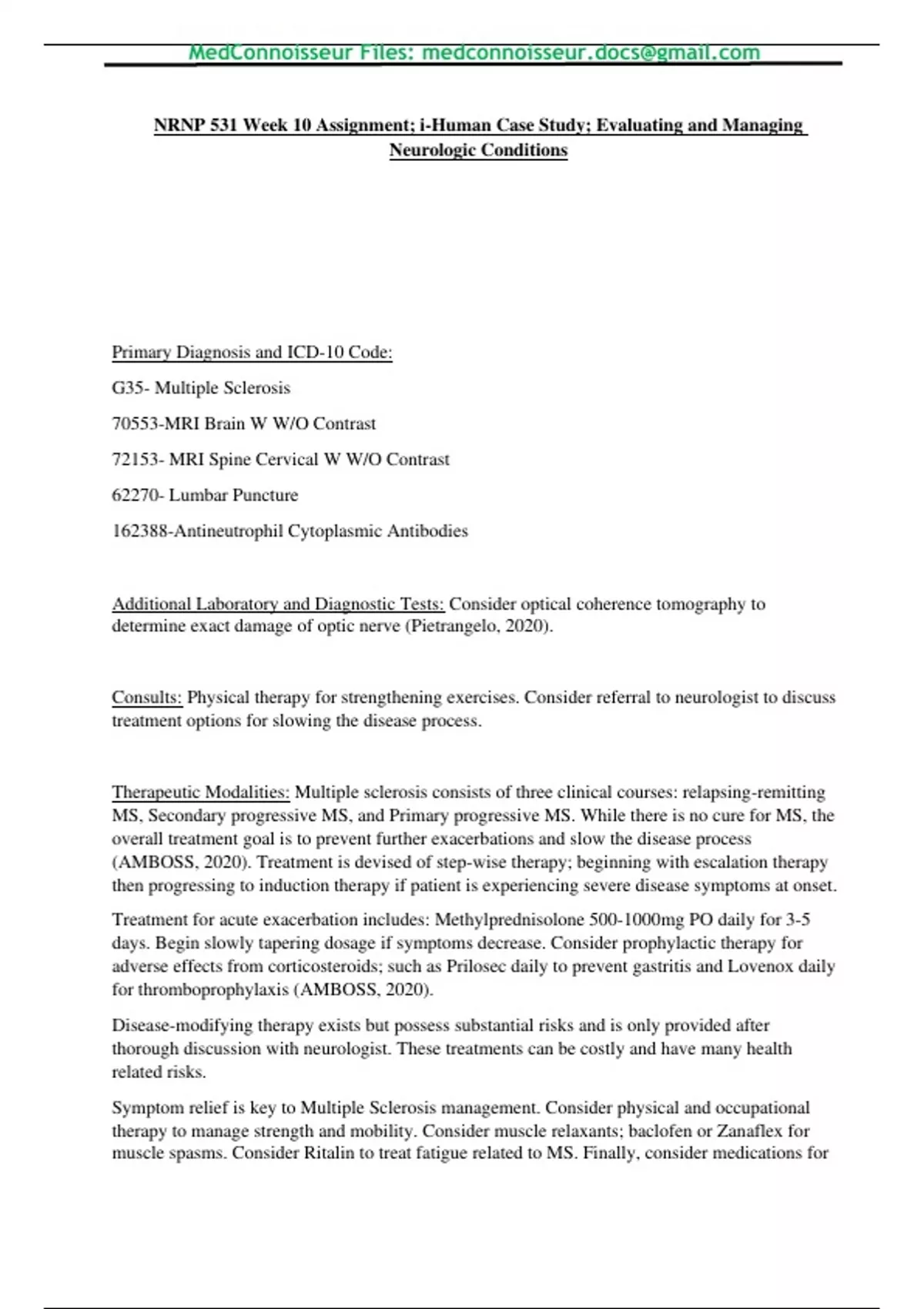 NRNP 6531 Week 10 Assignment; i-Human Case Study; Evaluating and Managing Neurologic Conditions Assignment: i-Human Case Study: Evaluating and Managing Neurologic Conditions As an advanced practice nurse, you will likely observe patients who experience neurological conditions. While patients with neurological conditions may present typical physical manifestations, such as headaches, dizziness, weakness, and fatigue, many manifestations may not be overtly physical, such as declining memory and social withdrawal. In all cases, your differential diagnosis must take into consideration the role of the patient history and physical examination. Photo Credit: Getty Images For this Case Study Assignment, you will analyze an i-Human simulation case study about an adult patient with a neurologic condition. Based on the patient’s information, you will formulate a differential diagnosis, evaluate treatment options, and create an appropriate treatment plan for the patient. To prepare: Review this week’s Learning Resources. Consider how to assess, diagnose, and treat patients with neurologic conditions. Accessi-Humanfromthisweek’s LearningResourcesandreviewthisweek’si-Humancasestudy AdeleSpencerV5PC.Basedontheprovidedpatientinformation,thinkaboutthehealthhistory you would need to collect from thepatient. Consider what physical exams and diagnostic tests would be appropriate to gather more information about the patient's condition. Reflect on how the results would be used to make a diagnosis. Identify three to five possible conditions that may be considered in a differential diagnosis for the patient. Consider the patient’s diagnosis. Think about clinical guidelines that might support this diagnosis. Developatreatmentplanforthepatientthatincludeshealthpromotionandpatienteducation strategies for patients with neurologicconditions. Assignment As you interact with this week’s i-Human patient, complete the assigned case study. For guidance on using i-Human, refer to the i-Human Patients Case Player Student Manual in the Week 1 Learning Resources. By Day 7 Complete your Assignment in i-Human.