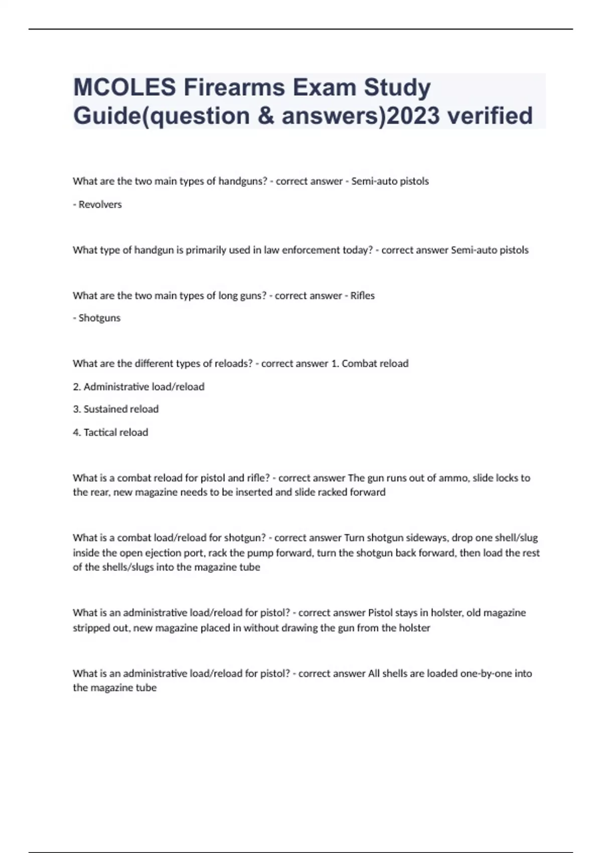MCOLES Firearms Exam Study Guide(question & answers)2023 verifiedWhat are the two main types of handguns? - correct answer - Semi-auto pistols - Revolvers What type of handgun is primarily used in law enforcement today? - correct answer Semi-auto pistols What are the two main types of long guns? - correct answer - Rifles - Shotguns What are the different types of reloads? - correct answer 1. Combat reload 2. Administrative load/reload 3. Sustained reload 4. Tactical reload What is a combat reload for pistol and rifle? - correct answer The gun runs out of ammo, slide locks to the rear, new magazine needs to be inserted and slide racked forward What is a combat load/reload for shotgun? - correct answer Turn shotgun sideways, drop one shell/slug inside the open ejection port, rack the pump forward, turn the shotgun back forward, then load the rest of the shells/slugs into the magazine tube What is an administrative load/reload for pistol? - correct answer Pistol stays in holster, old magazine stripped out, new magazine placed in without drawing the gun from the holster What is an administrative load/reload for pistol? - correct answer All shells are loaded one-by-one into the magazine tube