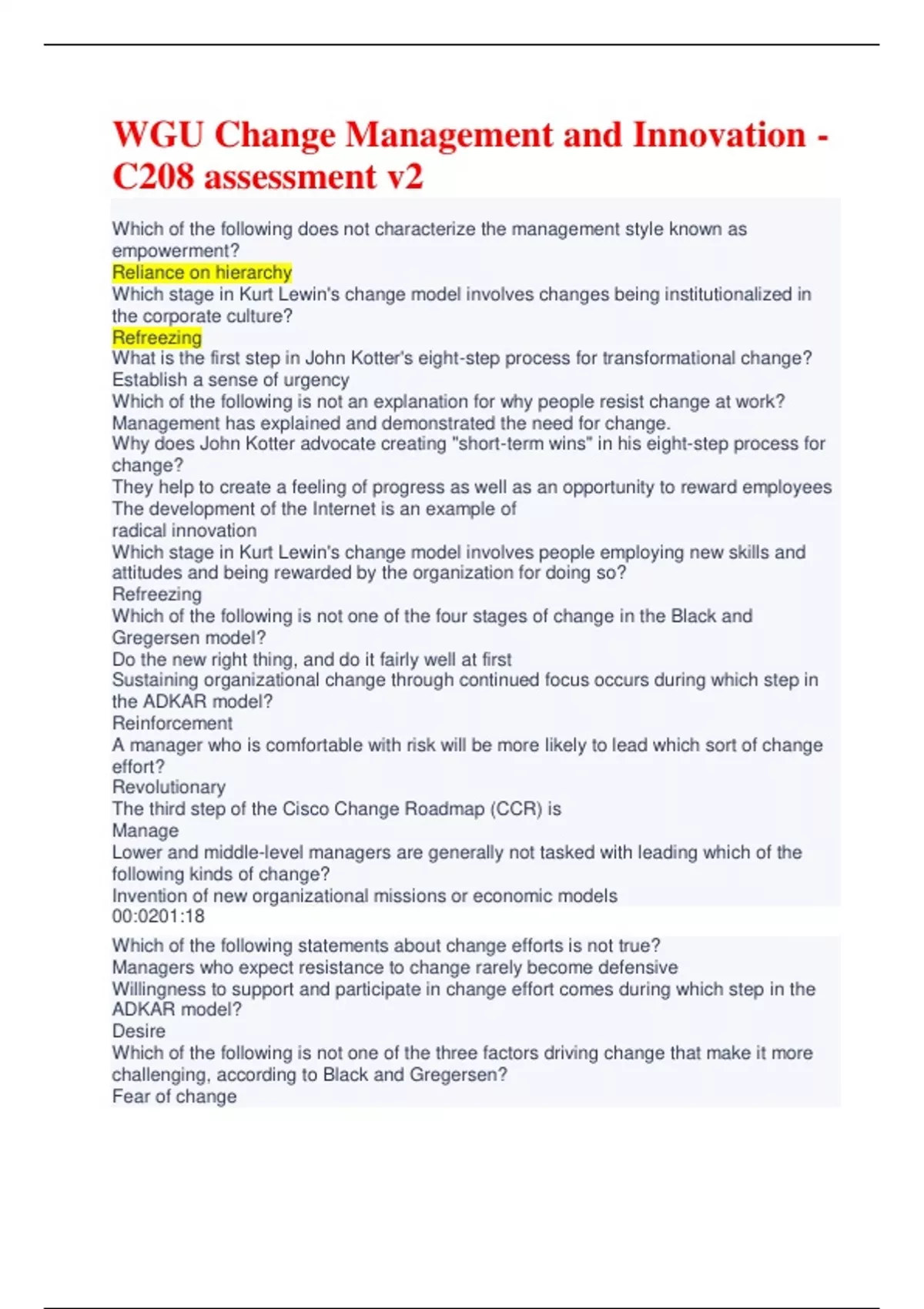 Which of the following does not characterize the management style known as empowerment? Reliance on hierarchy Which stage in Kurt Lewin's change model involves changes being institutionalized in the corporate culture? Refreezing What is the first step in John Kotter's eight-step process for transformational change? Establish a sense of urgency Which of the following is not an explanation for why people resist change at work? Management has explained and demonstrated the need for change. Why does John Kotter advocate creating "short-term wins" in his eight-step process for change? They help to create a feeling of progress as well as an opportunity to reward employees The development of the Internet is an example of radical innovation Which stage in Kurt Lewin's change model involves people employing new skills and attitudes and being rewarded by the organization for doing so? Refreezing Which of the following is not one of the four stages of change in the Black and Gregersen model? Do the new right thing, and do it fairly well at first Sustaining organizational change through continued focus occurs during which step in the ADKAR model? Reinforcement A manager who is comfortable with risk will be more likely to lead which sort of change effort? Revolutionary The third step of the Cisco Change Roadmap (CCR) is Manage Lower and middle-level managers are generally not tasked with leading which of the following kinds of change? Invention of new organizational missions or economic models 00:0201:18 Which of the following statements about change efforts is not true? Managers who expect resistance to change rarely become defensive Willingness to support and participate in change effort comes during which step in the ADKAR model? Desire Which of the following is not one of the three factors driving change that make it more challenging, according to Black and Gregersen? Fear of change