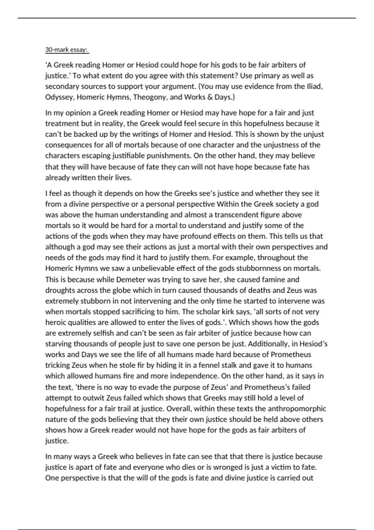 Exemplar essay to the question: 'A Greek reading Homer or Hesiod could hope for his gods to be fair arbiters of justice.’ To what extent do you agree with this statement? Use primary as well as secondary sources to support your argument. (You may use evidence from the Iliad, Odyssey, Homeric Hymns, Theogony, and Works & Days.)