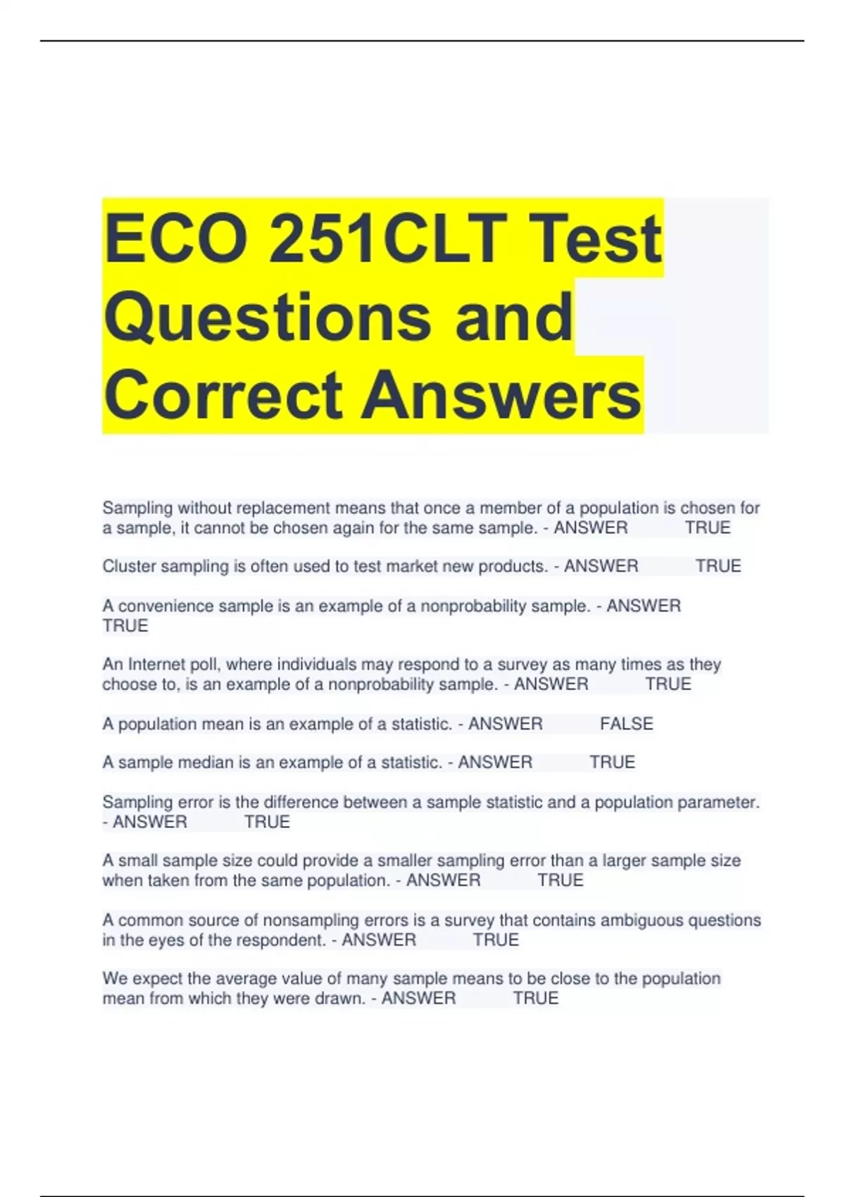 ECO 251CLT Test Questions and Correct Answers Sampling without replacement means that once a member of a population is chosen for a sample, it cannot be chosen again for the same sample. - ANSWER TRUE Cluster sampling is often used to test market new products. - ANSWER TRUE A convenience sample is an example of a nonprobability sample. - ANSWER TRUE An Internet poll, where individuals may respond to a survey as many times as they choose to, is an example of a nonprobability sample. - ANSWER TRUE A population mean is an example of a statistic. - ANSWER FALSE A sample median is an example of a statistic. - ANSWER TRUE Sampling error is the difference between a sample statistic and a population parameter. - ANSWER TRUE A small sample size could provide a smaller sampling error than a larger sample size when taken from the same population. - ANSWER TRUE A common source of nonsampling errors is a survey that contains ambiguous questions in the eyes of the respondent. - ANSWER TRUE We expect the average value of many sample means to be close to the population mean from which they were drawn. - ANSWER TRUE The standard error of the mean is the sample mean standard deviation, which measures the variation around the mean of the sample means. - ANSWER TRUE