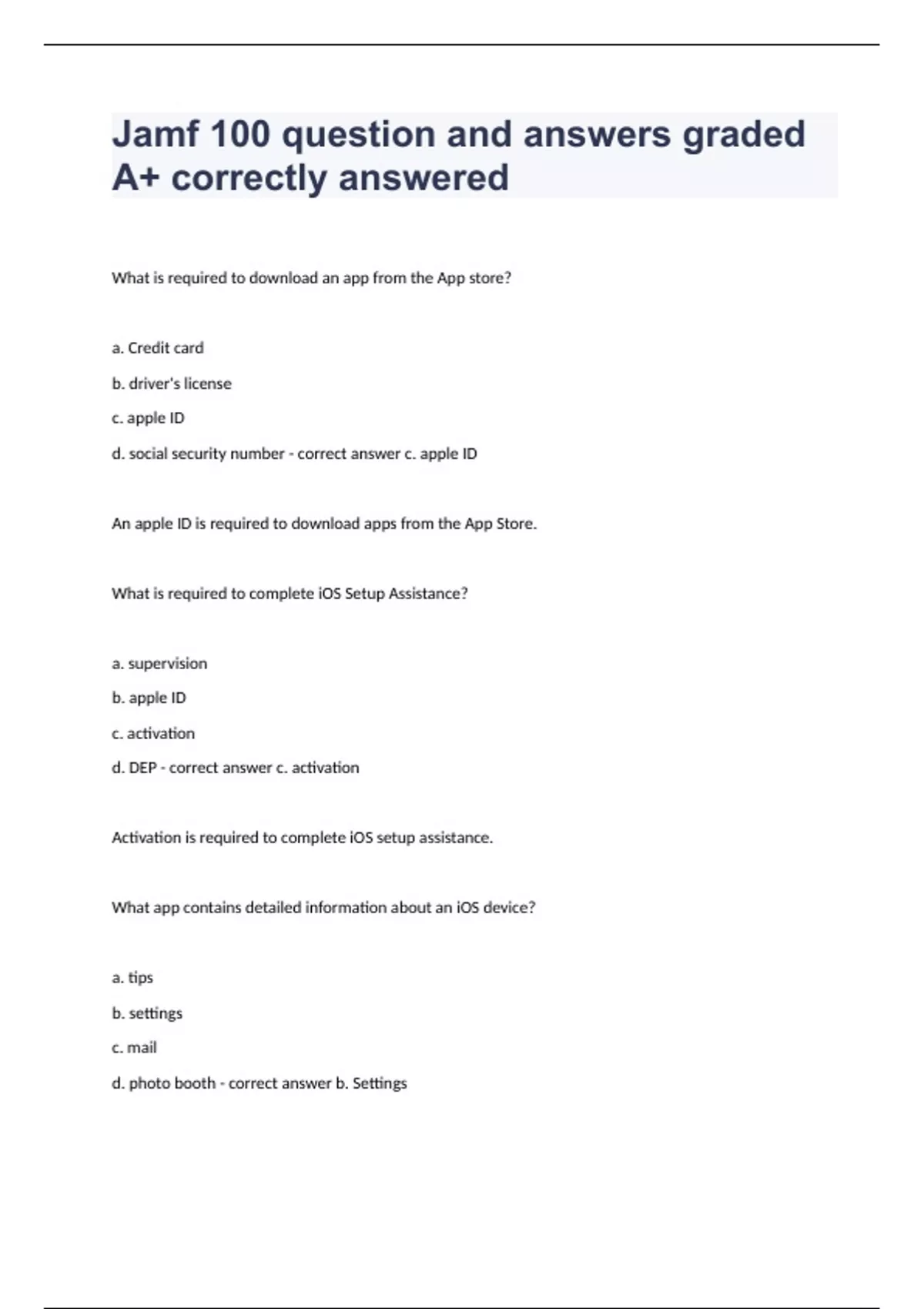 Jamf 100 question and answers graded A+ correctly answered What is required to download an app from the App store? a. Credit card b. driver's license c. apple ID d. social security number - correct answer c. apple ID An apple ID is required to download apps from the App Store. What is required to complete iOS Setup Assistance? a. supervision b. apple ID c. activation d. DEP - correct answer c. activation Activation is required to complete iOS setup assistance. What app contains detailed information about an iOS device? a. tips b. settings c. mail d. photo booth - correct answer b. Settings