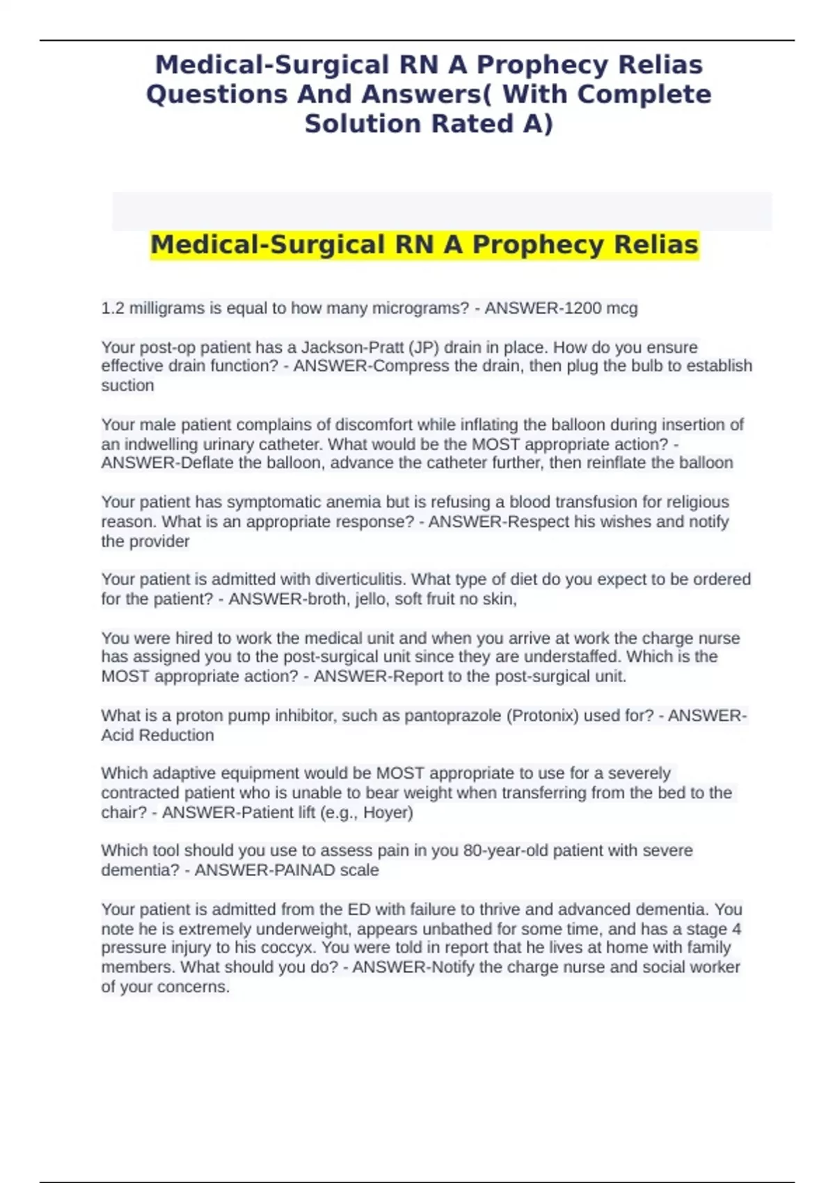 2023 Answered medical surgical RN a prophecy relias