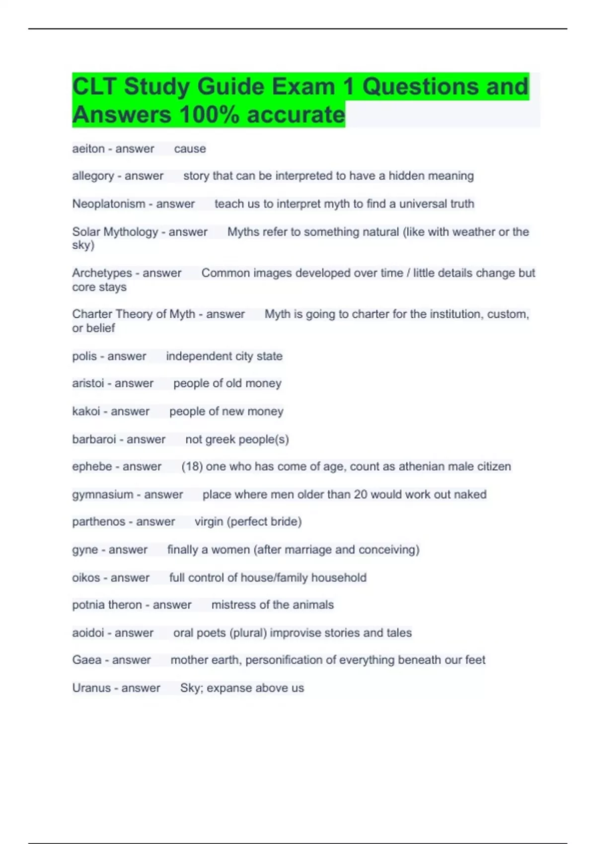 CLT Study Guide Exam 1 Questions and Answers 100% accurateaeiton cause allegory story that can be interpreted to have a hidden meaning Neoplatonism teach us to interpret myth to find a universal truth Solar Mythology Myths refer to something natural (like with weather or the sky) Archetypes Common images developed over time / little details change but core stays Charter Theory of Myth Myth is going to charter for the institution, custom, or belief polis independent city state aristoi people of old money kakoi people of new money barbaroi not greek people(s) ephebe (18) one who has come of age, count as athenian male citizen gymnasium place where men older than 20 would work out naked parthenos virgin (perfect bride) gyne finally a women (after marriage and conceiving) oikos full control of house/family household potnia theron mistress of the animals aoidoi oral poets (plural) improvise stories and tales Gaea mother earth, personification of everything beneath our feet Uranus Sky; expanse above us Tartarus below the earth Moirai Fates; responsible for our lives; 3 women Monster that at which you point in surprise Prometheus Forthought; made man