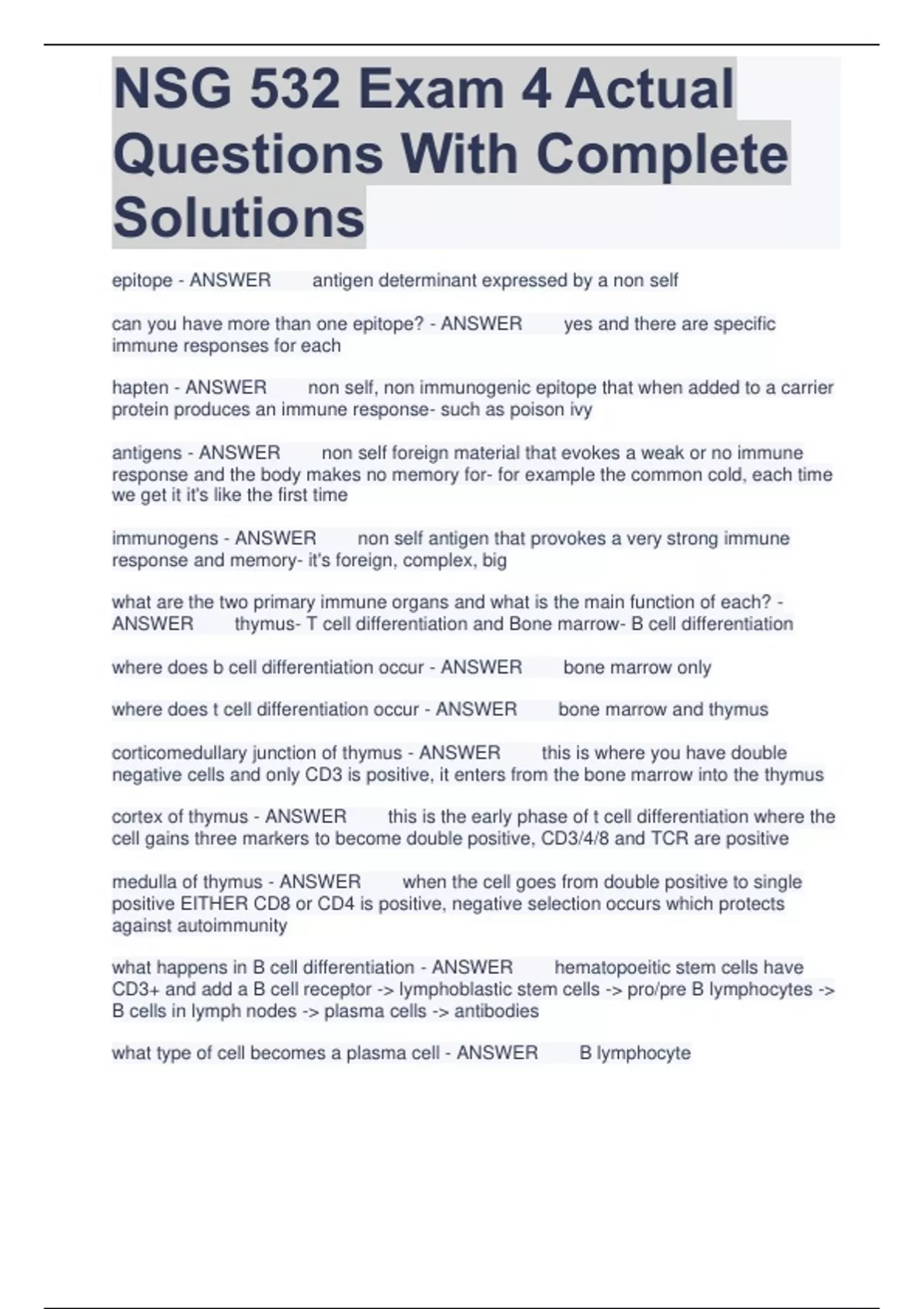NSG 532 Exam 4 Actual Questions With Complete Solutions epitope - ANSWER antigen determinant expressed by a non self can you have more than one epitope? - ANSWER yes and there are specific immune responses for each hapten - ANSWER non self, non immunogenic epitope that when added to a carrier protein produces an immune response- such as poison ivy antigens - ANSWER non self foreign material that evokes a weak or no immune response and the body makes no memory for- for example the common cold, each time we get it it's like the first time immunogens - ANSWER non self antigen that provokes a very strong immune response and memory- it's foreign, complex, big what are the two primary immune organs and what is the main function of each? - ANSWER thymus- T cell differentiation and Bone marrow- B cell differentiation where does b cell differentiation occur - ANSWER bone marrow only where does t cell differentiation occur - ANSWER bone marrow and thymus corticomedullary junction of thymus - ANSWER this is where you have double negative cells and only CD3 is positive, it enters from the bone marrow into the thymus cortex of thymus - ANSWER this is the early phase of t cell differentiation where the cell gains three markers to become double positive, CD3/4/8 and TCR are positive medulla of thymus - ANSWER when the cell goes from double positive to single positive EITHER CD8 or CD4 is positive, negative selection occurs which protects against autoimmunity what happens in B cell differentiation - ANSWER hematopoeitic stem cells have CD3+ and add a B cell receptor - lymphoblastic stem cells - pro/pre B lymphocytes - B cells in lymph nodes - plasma cells - antibodies what type of cell becomes a plasma cell - ANSWER B lymphocyte what type of immune cell is characterized by antigen specificity - ANSWER B lymphocytes where does the actual interaction between self and non self occur within the immune system? - ANSWER secondary immune organs- lymph nodes, peyers patches (ileum), tonsils, appendix