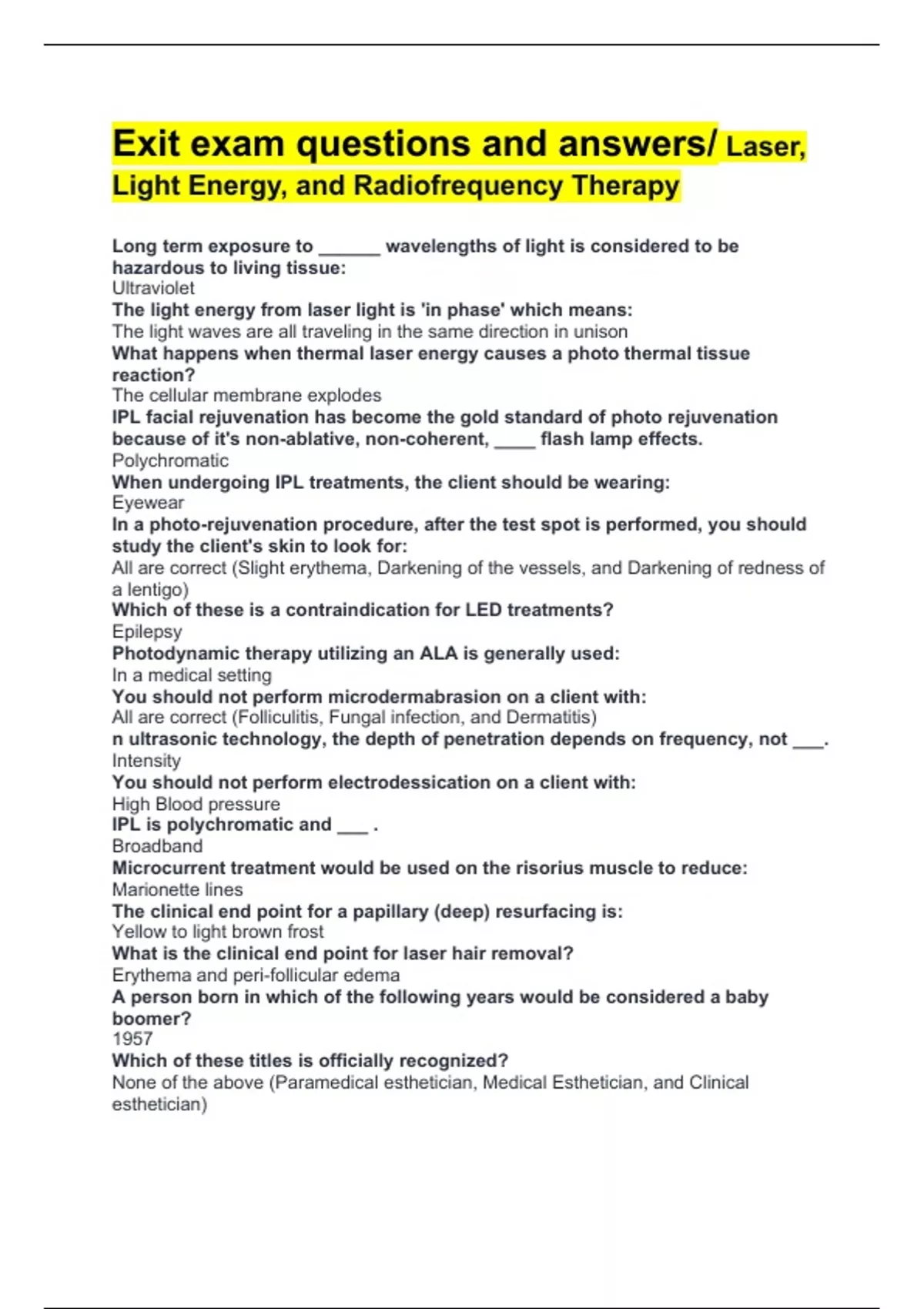 Exit exam questions and answers/ Laser, Light Energy, and Radiofrequency Therapy Long term exposure to ______ wavelengths of light is considered to be hazardous to living tissue: Ultraviolet The light energy from laser light is 'in phase' which means: The light waves are all traveling in the same direction in unison What happens when thermal laser energy causes a photo thermal tissue reaction? The cellular membrane explodes IPL facial rejuvenation has become the gold standard of photo rejuvenation because of it's non-ablative, non-coherent, ____ flash lamp effects. Polychromatic When undergoing IPL treatments, the client should be wearing: Eyewear In a photo-rejuvenation procedure, after the test spot is performed, you should study the client's skin to look for: All are correct (Slight erythema, Darkening of the vessels, and Darkening of redness of a lentigo) Which of these is a contraindication for LED treatments? Epilepsy Photodynamic therapy utilizing an ALA is generally used: In a medical setting You should not perform microdermabrasion on a client with: All are correct (Folliculitis, Fungal infection, and Dermatitis) n ultrasonic technology, the depth of penetration depends on frequency, not ___. Intensity You should not perform electrodessication on a client with: High Blood pressure IPL is polychromatic and ___ . Broadband Microcurrent treatment would be used on the risorius muscle to reduce: Marionette lines The clinical end point for a papillary (deep) resurfacing is: Yellow to light brown frost What is the clinical end point for laser hair removal? Erythema and peri-follicular edema A person born in which of the following years would be considered a baby boomer? 1957 Which of these titles is officially recognized? None of the above (Paramedical esthetician, Medical Esthetician, and Clinical esthetician)
