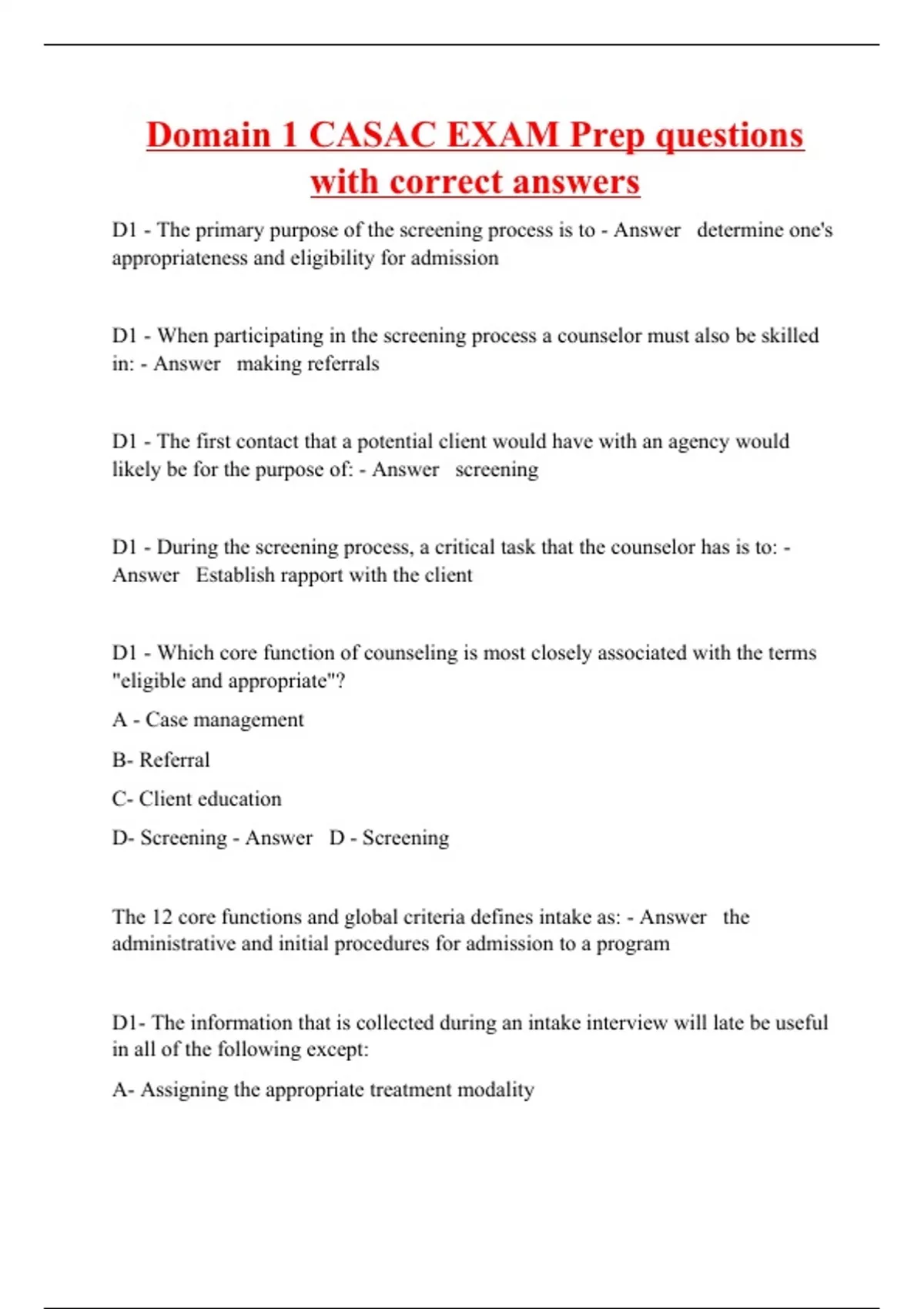 D1 - The primary purpose of the screening process is to - Answer determine one's appropriateness and eligibility for admission D1 - When participating in the screening process a counselor must also be skilled in: - Answer making referrals D1 - The first contact that a potential client would have with an agency would likely be for the purpose of: - Answer screening D1 - During the screening process, a critical task that the counselor has is to: - Answer Establish rapport with the client D1 - Which core function of counseling is most closely associated with the terms "eligible and appropriate"? A - Case management B- Referral C- Client education D- Screening - Answer D - Screening The 12 core functions and global criteria defines intake as: - Answer the administrative and initial procedures for admission to a program D1- The information that is collected during an intake interview will late be useful in all of the following except: A- Assigning the appropriate treatment modality
