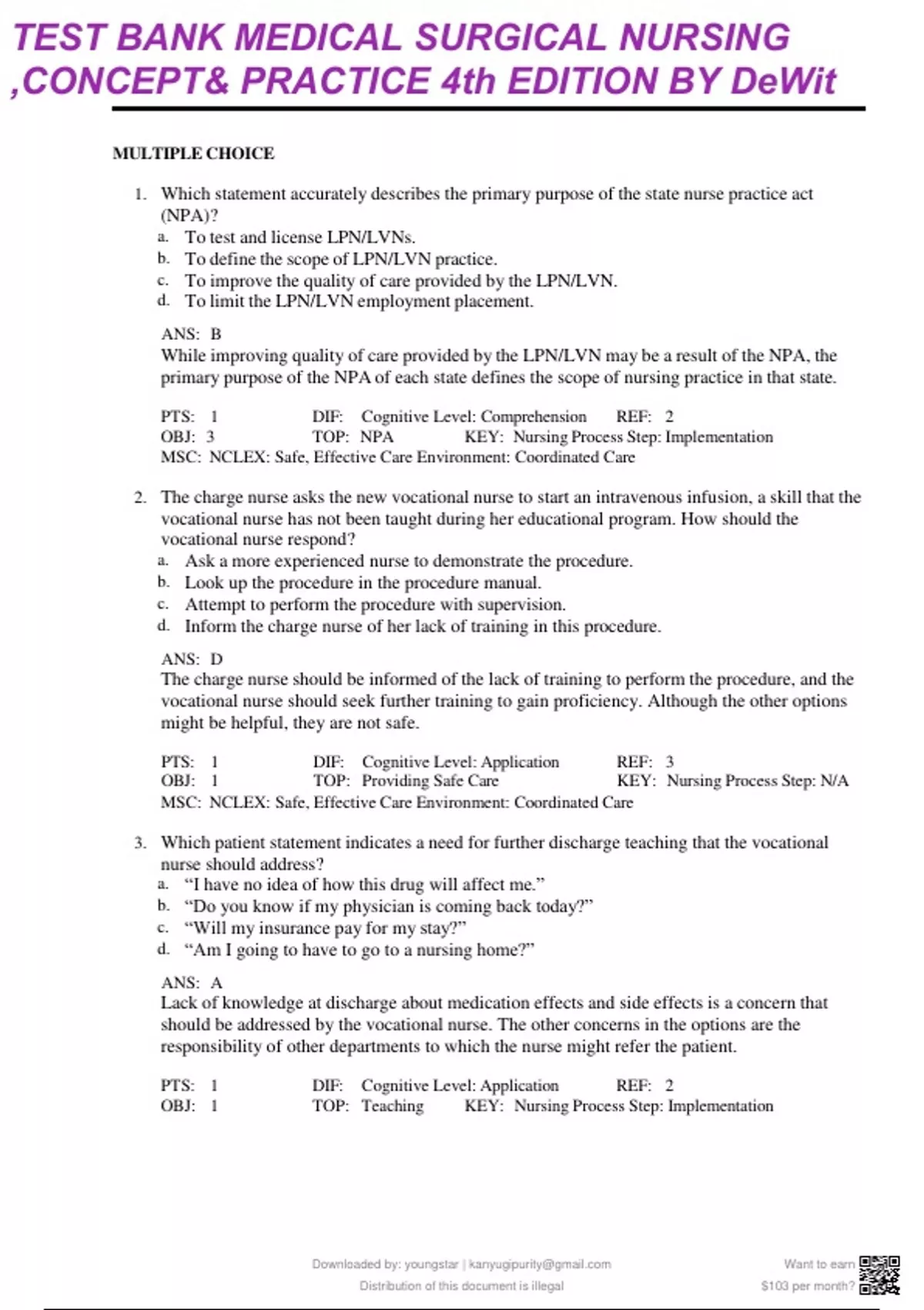 Chapter 01: Caring for Medical-Surgical Patients deWit: Medical-Surgical Nursing: Concepts & Practice, 4th Edition MULTIPLE CHOICE 1. Which statement accurately describes the primary purpose of the state nurse practice act (NPA)? a. To test and license LPN/LVNs. b. To define the scope of LPN/LVN practice. c. To improve the quality of care provided by the LPN/LVN. d. To limit the LPN/LVN employment placement. ANS: B While improving quality of care provided by the LPN/LVN may be a result of the NPA, the primary purpose of the NPA of each state defines the scope of nursing practice in that state. PTS: 1 DIF: Cognitive Level: Comprehension REF: 2 OBJ: 3 TOP: NPA KEY: Nursing Process Step: Implementation MSC: NCLEX: Safe, Effective Care Environment: Coordinated Care 2. The charge nurse asks the new vocational nurse to start an intravenous infusion, a skill that the vocational nurse has not been taught during her educational program. How should the vocational nurse respond? a. Ask a more experienced nurse to demonstrate the procedure. b. Look up the procedure in the procedure manual. c. Attempt to perform the procedure with supervision. d. Inform the charge nurse of her lack of training in this procedure. ANS: D The charge nurse should be informed of the lack of training to perform the procedure, and the vocational nurse should seek further training to gain proficiency. Although the other options might be helpful, they are not safe. PTS: 1 DIF: Cognitive Level: Application REF: 3 OBJ: 1 TOP: Providing Safe Care KEY: Nursing Process Step: N/A MSC: NCLEX: Safe, Effective Care Environment: Coordinated Care 3. Which patient statement indicates a need for further discharge teaching that the vocational nurse should address? a. “I have no idea of how this drug will affect me.” b. “Do you know if my physician is coming back today?” c. “Will my insurance pay for my stay?” d. “Am I going to have to go to a nursing home?” ANS: A Lack of knowledge at discharge about medication effects and side effects is a concern that should be addressed by the vocational nurse. The other concerns in the options are the responsibility of other departments to which the nurse might refer the patient.
