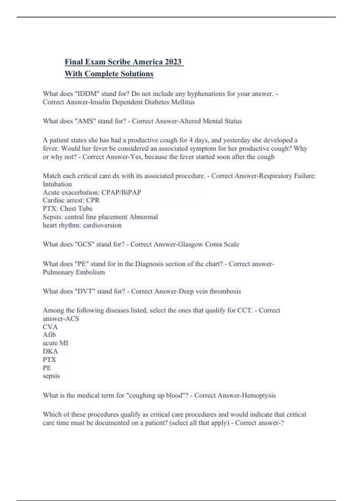 What does "IDDM" stand for? Do not include any hyphenations for your answer. - Correct Answer-Insulin Dependent Diabetes Mellitus What does "AMS" stand for? - Correct Answer-Altered Mental Status A patient states she has had a productive cough for 4 days, and yesterday she developed a fever. Would her fever be considered an associated symptom for her productive cough? Why or why not? - Correct Answer-Yes, because the fever started soon after the cough Match each critical care dx with its associated procedure. - Correct Answer-Respiratory Failure: Intubation Acute exacerbation: CPAP/BiPAP Cardiac arrest: CPR PTX: Chest Tube Sepsis: central line placement Abnormal heart rhythm: cardioversion What does "GCS" stand for? - Correct Answer-Glasgow Coma Scale What does "PE" stand for in the Diagnosis section of the chart? - Correct answer- Pulmonary Embolism What does "DVT" stand for? - Correct Answer-Deep vein thrombosis Among the following diseases listed, select the ones that qualify for CCT. - Correct answer-ACS CVA Afib acute MI DKA PTX PE sepsis What is the medical term for "coughing up blood"? - Correct Answer-Hemoptysis Which of these procedures qualify as critical care procedures and would indicate that critical care time must be documented on a patient? (select all that apply) - Correct answer-? If a patient signs a waiver giving you permission to capture photo of their unique rash, would you be committing a HIPAA violation by using your cellphone to capture the photo? (Select the best option.) - Correct Answer-Yes because the phone is not an approved hospital device and it is not encrypted. What procedure would be used to diagnose Meningitis? Expand the medical abbreviation into the full medical term. - Correct Answer-Lumbar puncture A female patient has been pregnant four times in the past, is currently pregnant, and has two children at home. Calculate the G, P and A, respectively. (Type your answer using the following format: "G,P,A" "#,#,#"; so for example you would type 0,0,0 with no spaces before or after the answer) - Correct answer-5,2,2 ....................................................CONTINUED......................................