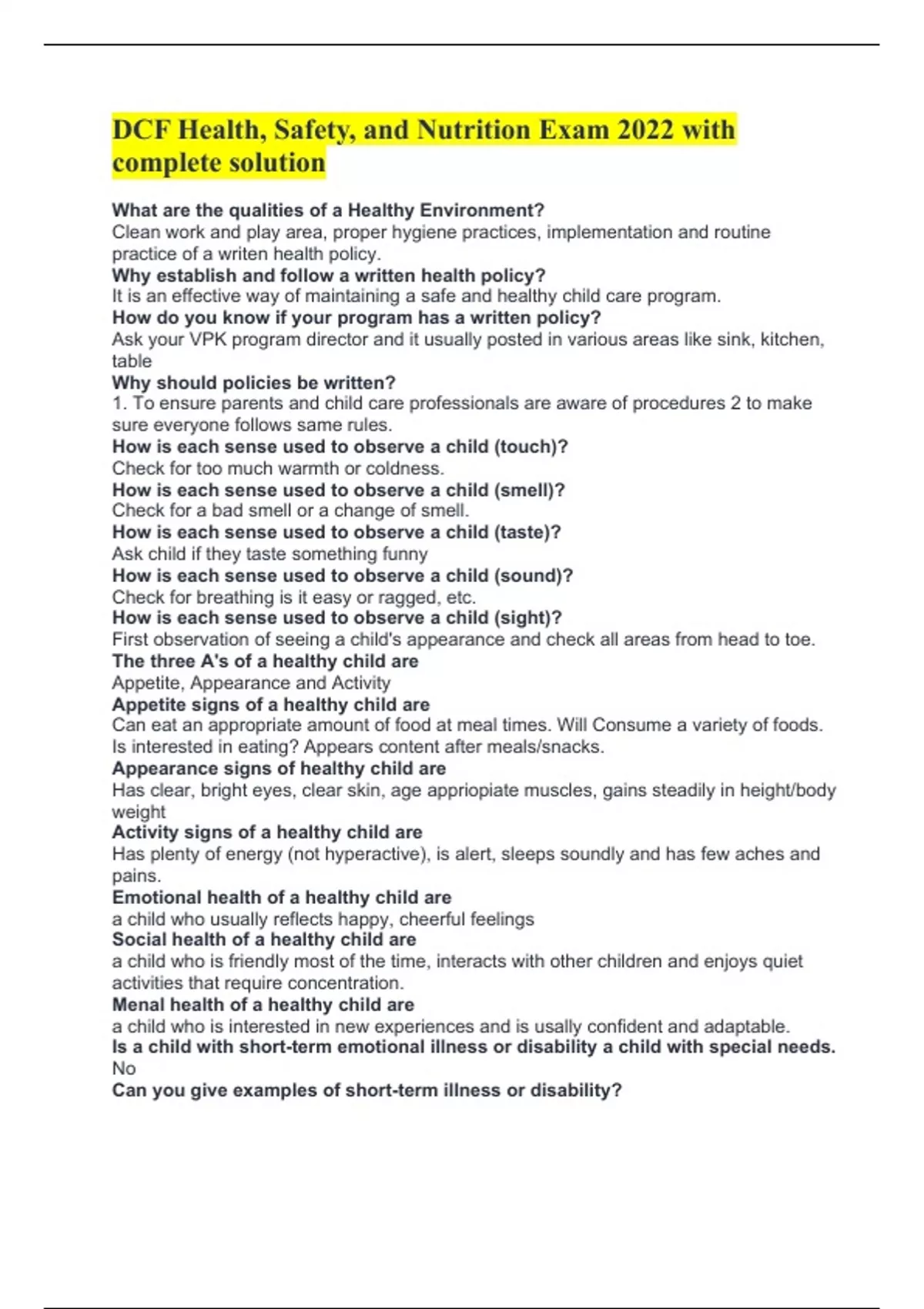 DCF Health, Safety, and Nutrition Exam 2022 with complete solution What are the qualities of a Healthy Environment? Clean work and play area, proper hygiene practices, implementation and routine practice of a writen health policy. Why establish and follow a written health policy? It is an effective way of maintaining a safe and healthy child care program. How do you know if your program has a written policy? Ask your VPK program director and it usually posted in various areas like sink, kitchen, table Why should policies be written? 1. To ensure parents and child care professionals are aware of procedures 2 to make sure everyone follows same rules. How is each sense used to observe a child (touch)? Check for too much warmth or coldness. How is each sense used to observe a child (smell)? Check for a bad smell or a change of smell. How is each sense used to observe a child (taste)? Ask child if they taste something funny How is each sense used to observe a child (sound)? Check for breathing is it easy or ragged, etc. How is each sense used to observe a child (sight)? First observation of seeing a child's appearance and check all areas from head to toe. The three A's of a healthy child are Appetite, Appearance and Activity Appetite signs of a healthy child are Can eat an appropriate amount of food at meal times. Will Consume a variety of foods. Is interested in eating? Appears content after meals/snacks. Appearance signs of healthy child are Has clear, bright eyes, clear skin, age appriopiate muscles, gains steadily in height/body weight Activity signs of a healthy child are Has plenty of energy (not hyperactive), is alert, sleeps soundly and has few aches and pains. Emotional health of a healthy child are a child who usually reflects happy, cheerful feelings Social health of a healthy child are a child who is friendly most of the time, interacts with other children and enjoys quiet activities that require concentration. Menal health of a healthy child are a child who is interested in new experiences and is usally confident and adaptable. Is a child with short-term emotional illness or disability a child with special needs. No Can you give examples of short-term illness or disability?
