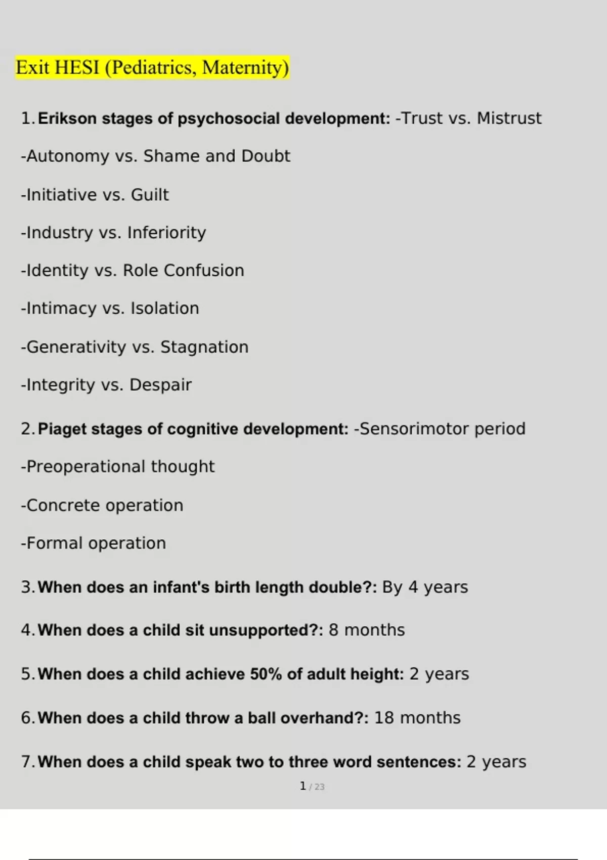 2023/2024 HESI Maternity/Pediatrics (PEDS) Exam