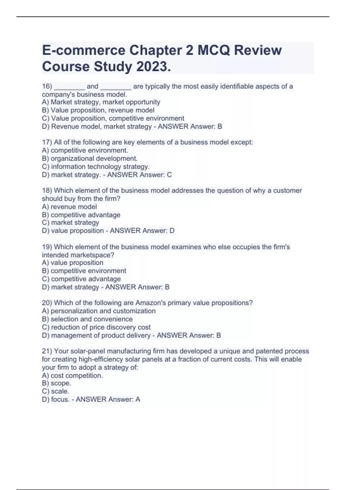 E-commerce Chapter 2 MCQ Review Course Study 2023.16) ________ and ________ are typically the most easily identifiable aspects of a company's business model. A) Market strategy, market opportunity B) Value proposition, revenue model C) Value proposition, competitive environment D) Revenue model, market strategy - ANSWER Answer: B 17) All of the following are key elements of a business model except: A) competitive environment. B) organizational development. C) information technology strategy. D) market strategy. - ANSWER Answer: C 18) Which element of the business model addresses the question of why a customer should buy from the firm? A) revenue model B) competitive advantage C) market strategy D) value proposition - ANSWER Answer: D 19) Which element of the business model examines who else occupies the firm's intended marketspace? A) value proposition B) competitive environment C) competitive advantage D) market strategy - ANSWER Answer: B 20) Which of the following are Amazon's primary value propositions? A) personalization and customization B) selection and convenience C) reduction of price discovery cost D) management of product delivery - ANSWER Answer: B 21) Your solar-panel manufacturing firm has developed a unique and patented process for creating high-efficiency solar panels at a fraction of current costs. This will enable your firm to adopt a strategy of: A) cost competition. B) scope. C) scale. D) focus. - ANSWER Answer: A
