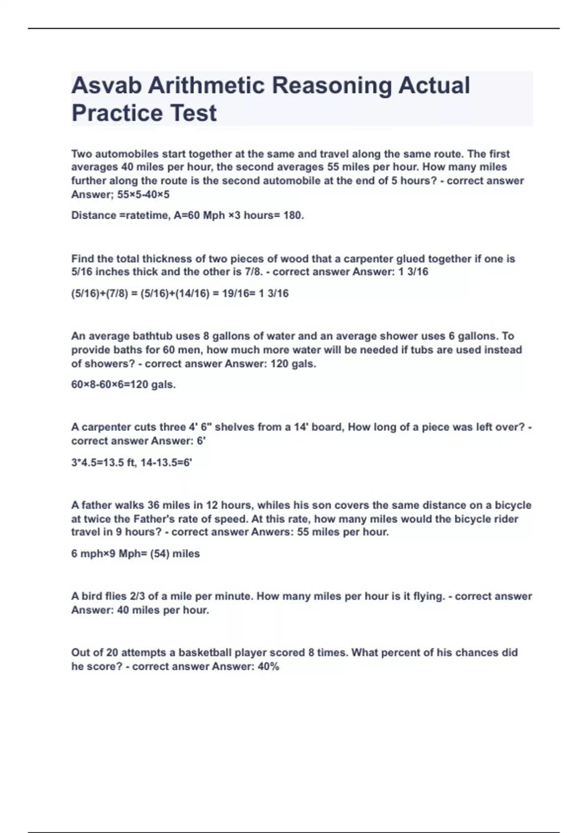 Two automobiles start together at the same and travel along the same route. The first averages 40 miles per hour, the second averages 55 miles per hour. How many miles further along the route is the second automobile at the end of 5 hours? Answer; 55×5-40×5 Distance =ratetime, A=60 Mph ×3 hours= 180. Find the total thickness of two pieces of wood that a carpenter glued together if one is 5/16 inches thick and the other is 7/8. Answer: 1 3/16 (5/16)+(7/8) = (5/16)+(14/16) = 19/16= 1 3/16 An average bathtub uses 8 gallons of water and an average shower uses 6 gallons. To provide baths for 60 men, how much more water will be needed if tubs are used instead of showers? Answer: 120 gals. 60×8-60×6=120 gals. A carpenter cuts three 4' 6" shelves from a 14' board, How long of a piece was left over? Answer: 6' 3*4.5=13.5 ft, 14-13.5=6' A father walks 36 miles in 12 hours, whiles his son covers the same distance on a bicycle at twice the Father's rate of speed. At this rate, how many miles would the bicycle rider travel in 9 hours? Anwers: 55 miles per hour. 6 mph×9 Mph= (54) miles A bird flies 2/3 of a mile per minute. How many miles per hour is it flying. Answer: 40 miles per hour. Out of 20 attempts a basketball player scored 8 times. What percent of his chances did he score? Answer: 40% How many 35-passenger buses will it take to carry 140 people? Answer: 4 buses Divide 144 by 35 then round up to next whole number. If 12 men are needed to run 4 machines. How many men are needed to run 20? Answer: 60 divide 12 by 4 =3.×20=60 A pole is 24 ft high, and has a shadow of 8 ft long. A nearby pole is 72 feet high. How long is its shadow? Answer: 24 ft. x=72 (8/24) ×=24