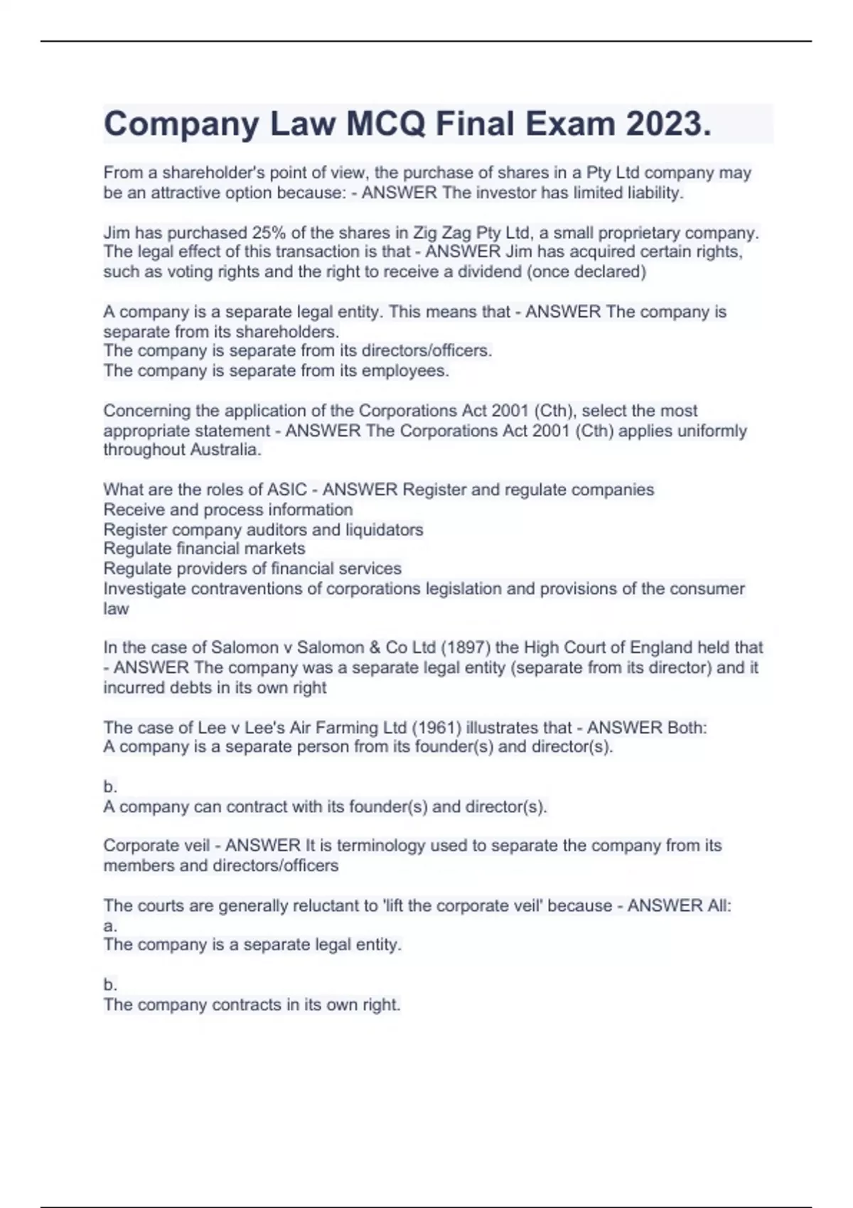 Company Law MCQ Final Exam 2023. From a shareholder's point of view, the purchase of shares in a Pty Ltd company may be an attractive option because: - ANSWER The investor has limited liability. Jim has purchased 25% of the shares in Zig Zag Pty Ltd, a small proprietary company. The legal effect of this transaction is that - ANSWER Jim has acquired certain rights, such as voting rights and the right to receive a dividend (once declared) A company is a separate legal entity. This means that - ANSWER The company is separate from its shareholders. The company is separate from its directors/officers. The company is separate from its employees. Concerning the application of the Corporations Act 2001 (Cth), select the most appropriate statement - ANSWER The Corporations Act 2001 (Cth) applies uniformly throughout Australia. What are the roles of ASIC - ANSWER Register and regulate companies Receive and process information Register company auditors and liquidators Regulate financial markets Regulate providers of financial services Investigate contraventions of corporations legislation and provisions of the consumer law In the case of Salomon v Salomon & Co Ltd (1897) the High Court of England held that - ANSWER The company was a separate legal entity (separate from its director) and it incurred debts in its own right The case of Lee v Lee's Air Farming Ltd (1961) illustrates that - ANSWER Both: A company is a separate person from its founder(s) and director(s). b. A company can contract with its founder(s) and director(s). Corporate veil - ANSWER It is terminology used to separate the company from its members and directors/officers The courts are generally reluctant to 'lift the corporate veil' because - ANSWER All: a. The company is a separate legal entity. b. The company contracts in its own right.
