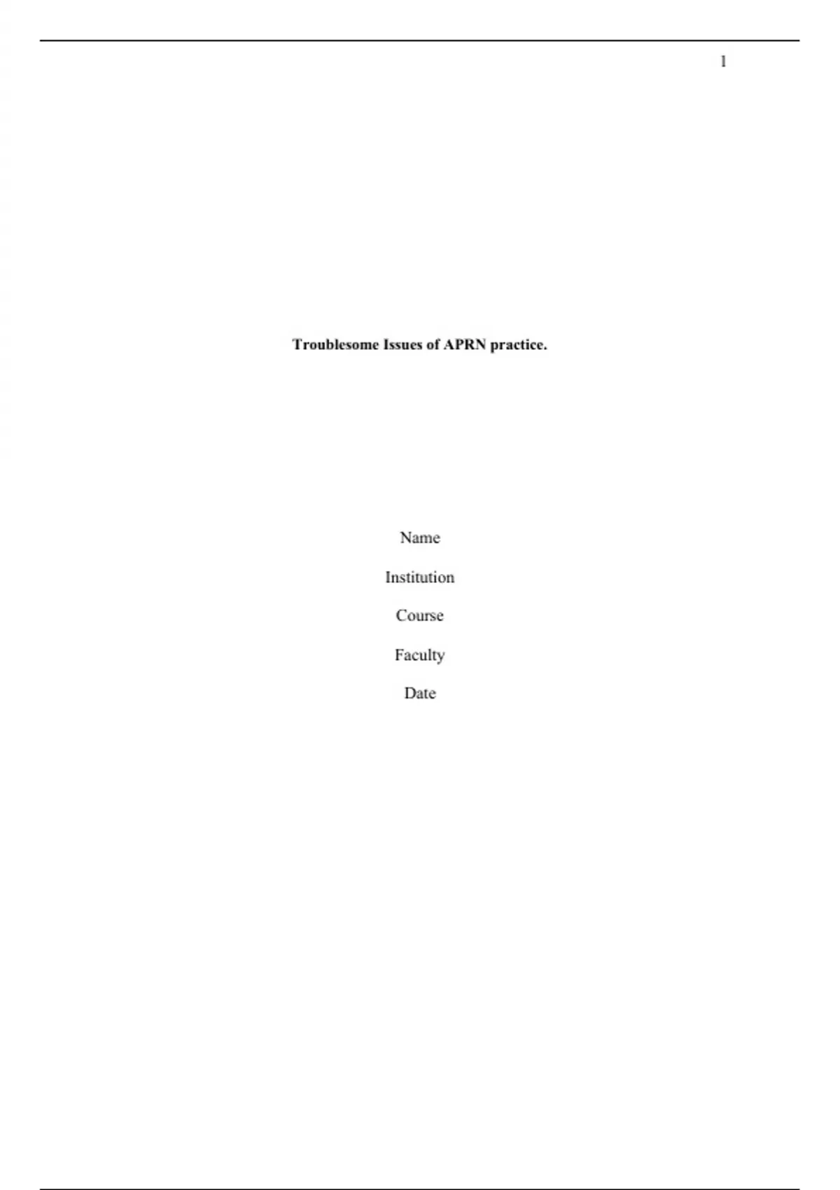 Discussion Prompt There are three troublesome issues that have emerged in the advancement of APRN practice. These issues in APRN include: 1) the clear role development and morphed to fill gaps in services; 2) the lack of clarity regarding role uniqueness; and 3) the dearth in nursing specific outcomes. From your readings this week, discuss 1 of the 3 questions. Begin your discussion with the question you will be addressing. Why might the development and morphing of roles based on gaps in medicine be problematic for advancement of APRNs? What actions might a nurse take to reduce this? In what ways can an APRN distinguish his or her role from other nursing roles and medical counterparts? Why might this be important? How can APRNs encourage nursing-based outcome studies? Expectations Initial Post: Due: Friday, 11:59 pm PT Length: A minimum of 350 words, not including references Citations: At least one high-level scholarly reference in APA from within the last 5 years Requirements: 400