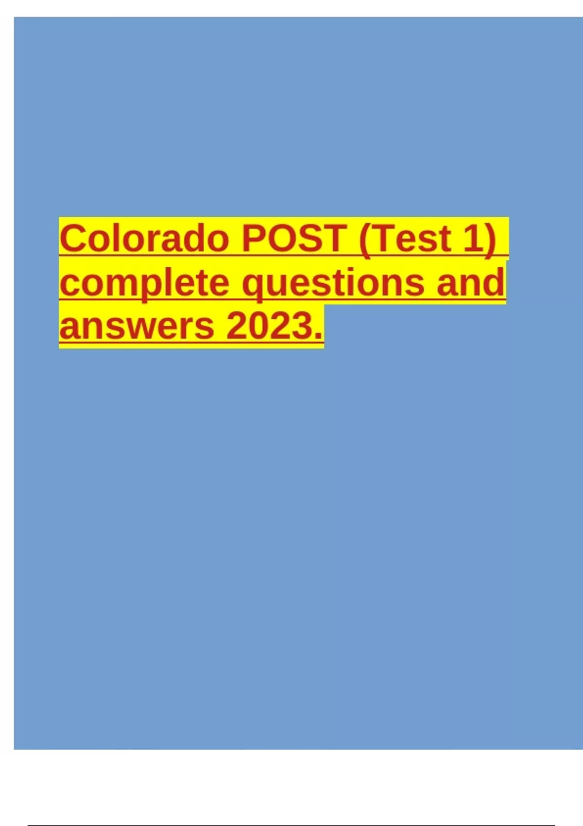Colorado POST (Test 1) complete questions and answers 2023. 1. What is the age requirement for safety belts?: Under 16, must be restrained 2. Which title of the CRS covers traffic?: Title 42 3. Title 42 includes: Title, Article, Part, Common Code, Points, Fine 4. Are traffic infractions arrestable offenses?: No 5. Are traffic violations arrestable offenses?: Yes 6. Can a person have a jury trial for traffic infractions or violations?: No. Judge trial only 7. A municipal officer cannot write municipal tickets for...: DUI, Registration, Licensing, Hit and Run. These violations go to county 8. Can officers issue a summons for a felony?: No. These must go to the district attorney 9. What class is a basic driver's license?: R 10. How long do you have to notify the state of changes to your driver's license (DL), such as change of address: 30 days 11. When do license plates expire?: End of the following month 12. Can a motorist block an intersection even if they have the green light?- : No. 42-4-709 Stop when traffic obstructed No driver shall enter an intersection or a marked crosswalk or drive onto any railroad grade crossing unless there is sufficient space on the other side of the intersection, crosswalk, or railroad grade crossing to accommodate the vehicle the driver is operating without obstructing the passage of other vehicles, pedestrians, or railroad trains, notwithstanding the indication of any traffic control signal to proceed. Any person who violates any provision of this section commits a class A traffic infraction. 13. While a fire apparatus is responding to a fire alarm, how far back must a motorist follow: No closer than 500ft 14. Must motorists come to a complete stop at a stop sign?: Yes. 15. Can people alter, damage, or remove traffic signage?: No. Two charges may be filed. Theft, and .... 42-4-607 Interference with official devices (1)(a) No person shall, without lawful authority, attempt to or in fact alter, deface, injure, knock down, remove, or interfere with the effective operation of any official traffic control device or any railroad sign or signal or any inscription, shield, or insignia thereon or any other part thereof. Except as otherwise provided in subsection (2) of this section, any person who violates any provision of