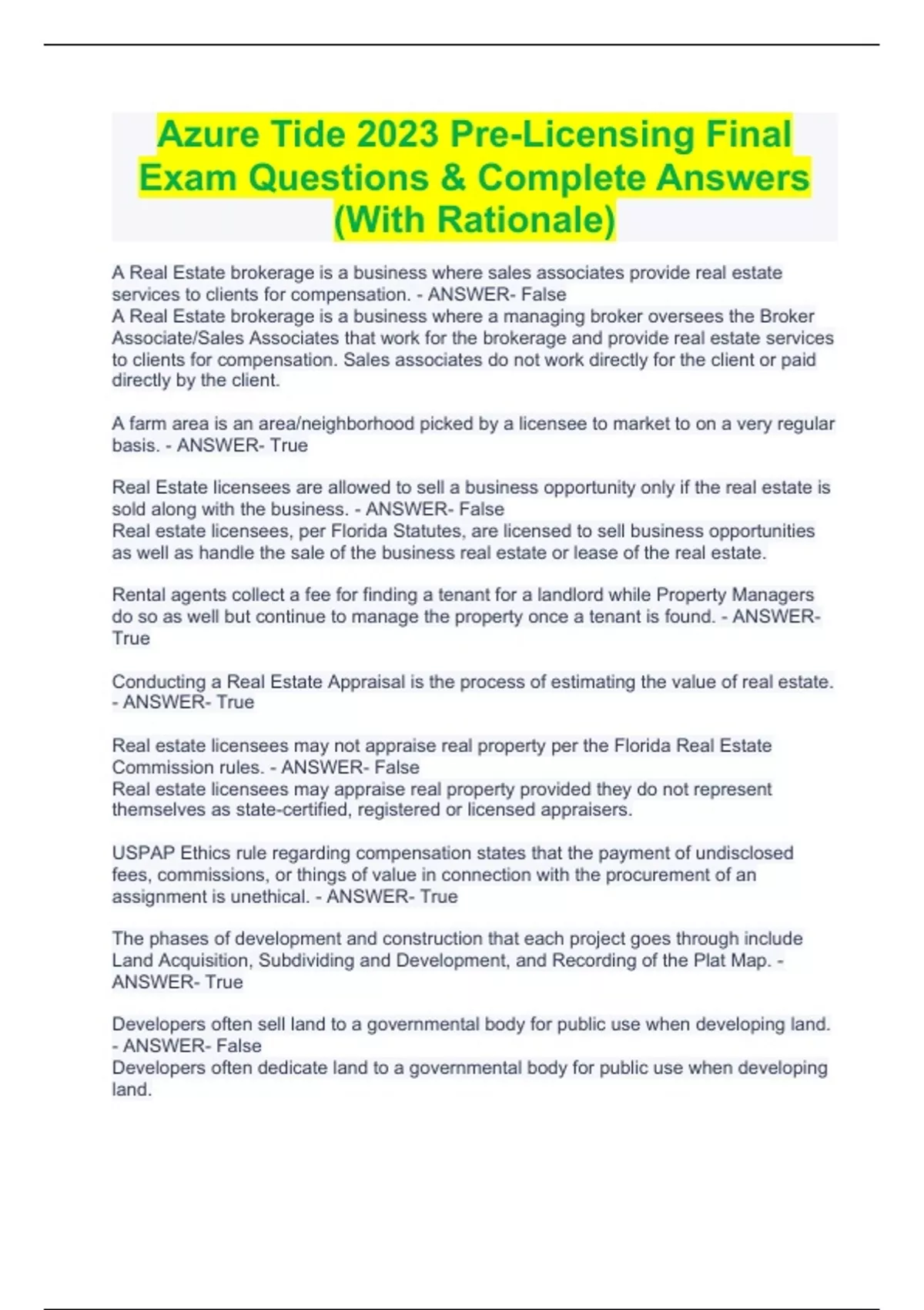 Azure Tide 2023 Pre-Licensing Final Exam Questions & Complete Answers (With Rationale) Azure Tide 2023 Pre-Licensing Final Exam Questions & Complete Answers (With Rationale) A Real Estate brokerage is a business where sales associates provide real estate services to clients for compensation. - ANSWER- False A Real Estate brokerage is a business where a managing broker oversees the Broker Associate/Sales Associates that work for the brokerage and provide real estate services to clients for compensation. Sales associates do not work directly for the client or paid directly by the client. A farm area is an area/neighborhood picked by a licensee to market to on a very regular basis. - ANSWER- True Real Estate licensees are allowed to sell a business opportunity only if the real estate is sold along with the business. - ANSWER- False Real estate licensees, per Florida Statutes, are licensed to sell business opportunities as well as handle the sale of the business real estate or lease of the real estate. Rental agents collect a fee for finding a tenant for a landlord while Property Managers do so as well but continue to manage the property once a tenant is found. - ANSWER- True Conducting a Real Estate Appraisal is the process of estimating the value of real estate. - ANSWER- True Real estate licensees may not appraise real property per the Florida Real Estate Commission rules. - ANSWER- False Real estate licensees may appraise real property provided they do not represent themselves as state-certified, registered or licensed appraisers. USPAP Ethics rule regarding compensation states that the payment of undisclosed fees, commissions, or things of value in connection with the procurement of an assignment is unethical. - ANSWER- True The phases of development and construction that each project goes through include Land Acquisition, Subdividing and Development, and Recording of the Plat Map. - ANSWER- True Developers often sell land to a governmental body for public use when developing land. - ANSWER- False Developers often dedicate land to a governmental body for public use when developing land.