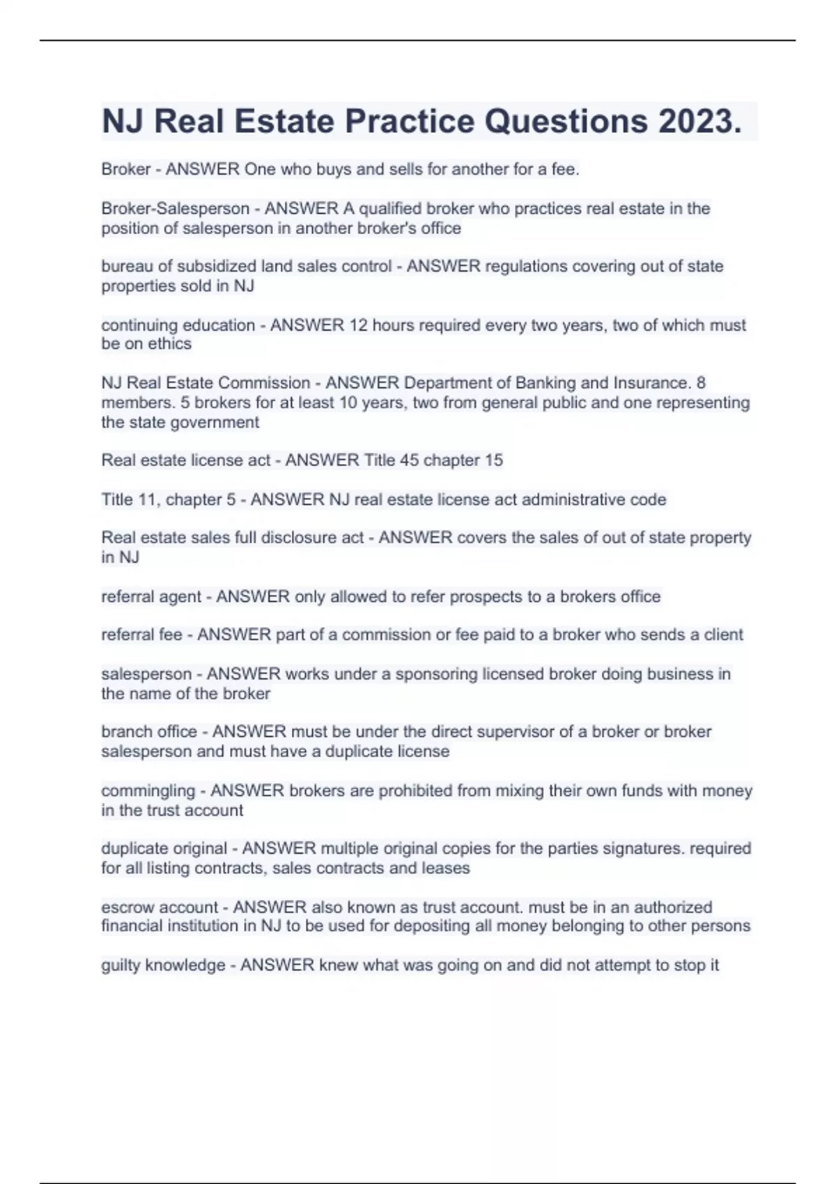NJ Real Estate Practice Questions 2023.Broker - ANSWER One who buys and sells for another for a fee. Broker-Salesperson - ANSWER A qualified broker who practices real estate in the position of salesperson in another broker's office bureau of subsidized land sales control - ANSWER regulations covering out of state properties sold in NJ continuing education - ANSWER 12 hours required every two years, two of which must be on ethics NJ Real Estate Commission - ANSWER Department of Banking and Insurance. 8 members. 5 brokers for at least 10 years, two from general public and one representing the state government Real estate license act - ANSWER Title 45 chapter 15 Title 11, chapter 5 - ANSWER NJ real estate license act administrative code Real estate sales full disclosure act - ANSWER covers the sales of out of state property in NJ referral agent - ANSWER only allowed to refer prospects to a brokers office referral fee - ANSWER part of a commission or fee paid to a broker who sends a client salesperson - ANSWER works under a sponsoring licensed broker doing business in the name of the broker branch office - ANSWER must be under the direct supervisor of a broker or broker salesperson and must have a duplicate license commingling - ANSWER brokers are prohibited from mixing their own funds with money in the trust account duplicate original - ANSWER multiple original copies for the parties signatures. required for all listing contracts, sales contracts and leases escrow account - ANSWER also known as trust account. must be in an authorized financial institution in NJ to be used for depositing all money belonging to other persons guilty knowledge - ANSWER knew what was going on and did not attempt to stop it probation - ANSWER first step after a complaint against a licensee. fine of up to $5000 suspension - ANSWER suspend a license fine up to $10,000