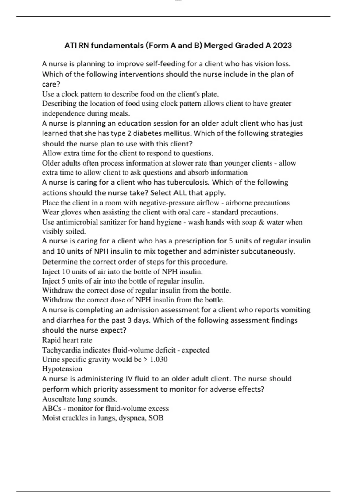 A nurse is planning to improve self-feeding for a client who has vision loss. Which of the following interventions should the nurse include in the plan of care? Use a clock pattern to describe food on the client's plate. Describing the location of food using clock pattern allows client to have greater independence during meals. A nurse is planning an education session for an older adult client who has just learned that she has type 2 diabetes mellitus. Which of the following strategies should the nurse plan to use with this client? Allow extra time for the client to respond to questions. Older adults often process information at slower rate than younger clients - allow extra time to allow client to ask questions and absorb information A nurse is caring for a client who has tuberculosis. Which of the following actions should the nurse take? Select ALL that apply. Place the client in a room with negative-pressure airflow - airborne precautions Wear gloves when assisting the client with oral care - standard precautions. Use antimicrobial sanitizer for hand hygiene - wash hands with soap & water when visibly soiled. A nurse is caring for a client who has a prescription for 5 units of regular insulin and 10 units of NPH insulin to mix together and administer subcutaneously. Determine the correct order of steps for this procedure. Inject 10 units of air into the bottle of NPH insulin. Inject 5 units of air into the bottle of regular insulin. Withdraw the correct dose of regular insulin from the bottle. Withdraw the correct dose of NPH insulin from the bottle. A nurse is completing an admission assessment for a client who reports vomiting and diarrhea for the past 3 days. Which of the following assessment findings should the nurse expect? Rapid heart rate Tachycardia indicates fluid-volume deficit - expected Urine specific gravity would be > 1.030 Hypotension A nurse is administering IV fluid to an older adult client. The nurse should perform which priority assessment to monitor for adverse effects? Auscultate lung sounds. ABCs - monitor for fluid-volume excess Moist crackles in lungs, dyspnea, SOB A nurse is assessing a client's readiness to learn about insulin administration. Which of the following statements should the nurse identify as an indication that the client is ready to learn? "I can concentrate best in the morning." verbalizing best time for him to learn. A nurse is admitting a client who has an abdominal wound with a large amount of purulent drainage. Which of the following types of transmission precautions should the nurse initiate? Contact precautions Major wound infections require contact precautions - admit client to private room. Caregivers should wear gown & gloves during direct contact. A nurse is reviewing practice guidelines with a group of newly licensed nurses. Which of the following interventions should the nurse include that is within the RN scope of practice? Initiate an enteral feeding through a gastrostomy tube. Initiate feedings through nasoenteric, gastrostomy, and jejunostomy tubes. A nurse is caring for a client who has a prescription for wound irrigation. Which of the following actions should the nurse take? Cleanse the wound from the center outward. Prevent introduction of micro-organisms from the outer skin surface. A nurse is caring for a client who reports pain. When documenting the quality of the client's pain on an initial pain assessment, the nurse should report which of the following client statements? "The pain is like a dull ache in my stomach." Describing quality of pain A nurse is caring for a client who is reporting difficulty falling asleep. Which of the following measures should the nurse recommend? Use progressive relaxation techniques at bedtime. promotes sleep by decreasing stress & reducing muscle tension. A nurse is caring for a client who is postoperative and refuses to use an incentive spirometer following major abdominal surgery. Which of the following is the nurse's priority action? Determine the reasons why the client is refusing to use the incentive spirometer. 1st - Assess A nurse is preparing to administer multiple medications to a client who has an enteral feeding tube. Which of the following actions should the nurse plan to take? Flush the tube with 15 mL of sterile water. Flush with 15-30 mL of sterile water before administration and between each medication. Flush feeding tube with 30-60 mL of sterile water following administration of last medication.