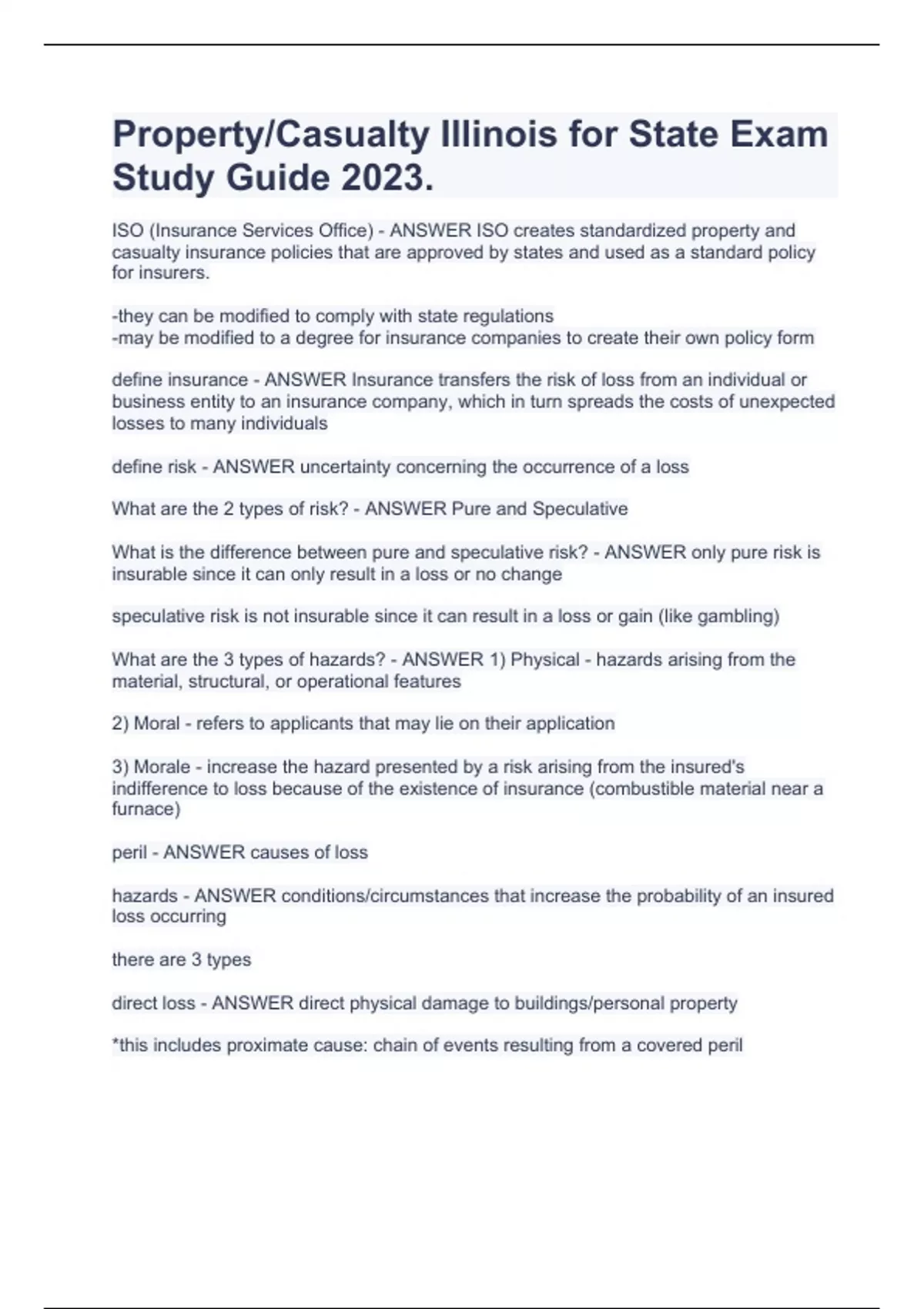 Property/Casualty Illinois for State Exam Study Guide 2023.SO (Insurance Services Office) - ANSWER ISO creates standardized property and casualty insurance policies that are approved by states and used as a standard policy for insurers. -they can be modified to comply with state regulations -may be modified to a degree for insurance companies to create their own policy form define insurance - ANSWER Insurance transfers the risk of loss from an individual or business entity to an insurance company, which in turn spreads the costs of unexpected losses to many individuals define risk - ANSWER uncertainty concerning the occurrence of a loss What are the 2 types of risk? - ANSWER Pure and Speculative What is the difference between pure and speculative risk? - ANSWER only pure risk is insurable since it can only result in a loss or no change speculative risk is not insurable since it can result in a loss or gain (like gambling) What are the 3 types of hazards? - ANSWER 1) Physical - hazards arising from the material, structural, or operational features 2) Moral - refers to applicants that may lie on their application 3) Morale - increase the hazard presented by a risk arising from the insured's indifference to loss because of the existence of insurance (combustible material near a furnace) peril - ANSWER causes of loss hazards - ANSWER conditions/circumstances that increase the probability of an insured loss occurring there are 3 types direct loss - ANSWER direct physical damage to buildings/personal property *this includes proximate cause: chain of events resulting from a covered peril