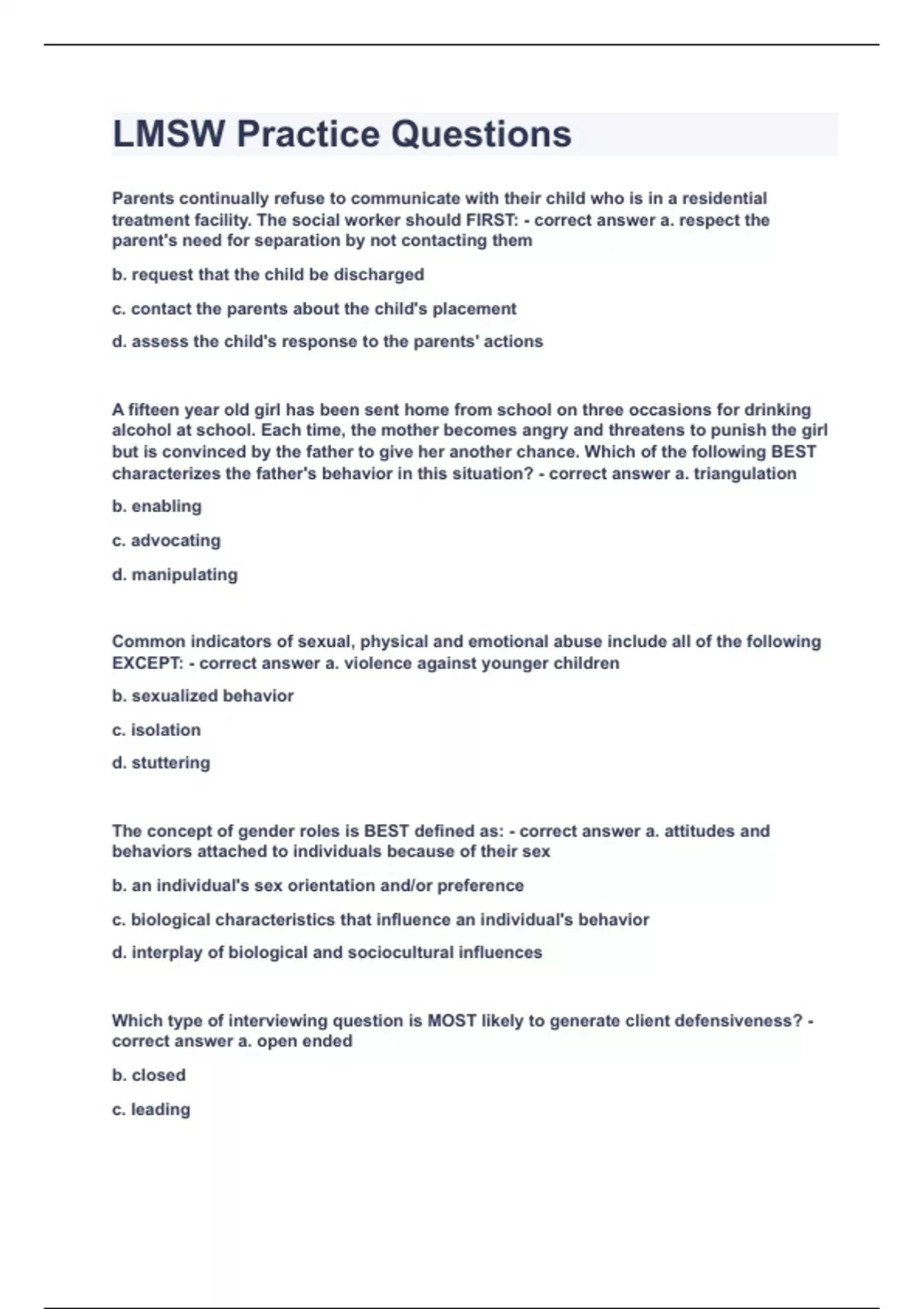 Parents continually refuse to communicate with their child who is in a residential treatment facility. The social worker should FIRST: a. respect the parent's need for separation by not contacting them b. request that the child be discharged c. contact the parents about the child's placement d. assess the child's response to the parents' actions A fifteen year old girl has been sent home from school on three occasions for drinking alcohol at school. Each time, the mother becomes angry and threatens to punish the girl but is convinced by the father to give her another chance. Which of the following BEST characterizes the father's behavior in this situation? a. triangulation b. enabling c. advocating d. manipulating Common indicators of sexual, physical and emotional abuse include all of the following EXCEPT: a. violence against younger children b. sexualized behavior c. isolation d. stuttering The concept of gender roles is BEST defined as: a. attitudes and behaviors attached to individuals because of their sex b. an individual's sex orientation and/or preference c. biological characteristics that influence an individual's behavior d. interplay of biological and sociocultural influences Which type of interviewing question is MOST likely to generate client defensiveness? a. open ended b. closed c. leading d. why When interviewing a client whose speech patterns are different from the social worker's, the social worker's PRIMARY consideration should be that: a. communication patterns vary due to economic conditions b. speech is influenced by culture and experience c. psychosocial conditions will cause variations in speech d. speech is influenced by group taboos and norms and may indicate false beliefs The initial symptoms of schizophrenia MOST often occur between which of the following years of age? a. 6 to 12 b. 13 to 16 c. 17 to 45 d. 16 to 60 Which of the following approaches would be MOST appropriate to use in evaluating client satisfaction with the social worker's provision of services? a. using a single system design, evaluate the quality of services b. in the final interview, ask the client about their level of satisfaction c. after submitting process recordings, ask supervisor for feedback d. at termination, ask clients to complete a service evaluation and satisfaction form When conducting an assessment of the risk factors of child abuse for a child of a different ethnic background, a social worker must FIRST: a. be aware of how personal cultural biases affect the social worker's ability to deal with issues of diversity b. realize that assessment models are not a substitute for clinical judgment or experience c. use a strengths' perspective rather than a deficit model to form a partnership with the child's family d. understand the need for appropriate eye contact, tone of voice and question techniques during the assessment A social worker is receiving a client with long-standing depression. It becomes known that the client has racist beliefs. The social worker should: a. respectfully confront the client's prejudiced beliefs b. educate the client about the negative effects of racism c. refer the client to another therapist who might have similar belief d. respect the client's beliefs and focus on the presenting problem The phase of the helping process which leads to subsequent implementation of intervention is: a. exploration and summation b. exploration, assessment and planning c. initiation of established rapport d. clarification and analysis When reviewing a social worker's performance, the supervisor notes that the social worker conveys little empathy toward clients who have recently left welfare and holding first jobs. In order to help the social worker develop empathy with her clients, the supervisor should: a. explain welfare-to-work procedures from the client's perspective b. suggest the social worker enter therapy to become a more empathetic person c. model empathetic communication when engaging with the social worker d. clarify the agency's reason for supporting these clients The purpose of feedback in a social worker interview is to: a. allow the social worker to confront distortions in the client's thinking b. summarize main points of the interview c. let the client know social worker understands the issue d. give the social worker opportunity to self-disclose for benefit of the client A social worker is leading a women's group with the purpose of improving personal and environmental circumstances. The social worker asks the members to identify the area in which they feel most competent. The social worker is following an intervention strategy BEST described as: a. reinforcement b. endorsement c. enhancement d. empowerment