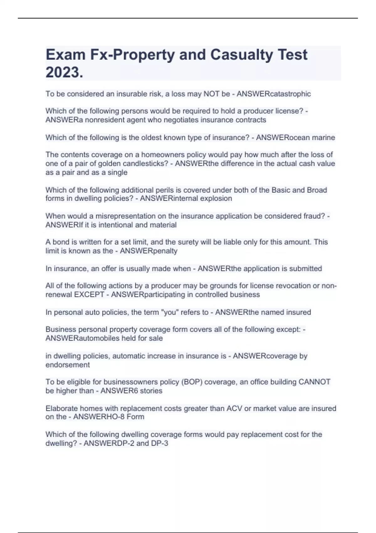 Exam Fx-Property and Casualty Test 2023. To be considered an insurable risk, a loss may NOT be - ANSWERcatastrophic Which of the following persons would be required to hold a producer license? - ANSWERa nonresident agent who negotiates insurance contracts Which of the following is the oldest known type of insurance? - ANSWERocean marine The contents coverage on a homeowners policy would pay how much after the loss of one of a pair of golden candlesticks? - ANSWERthe difference in the actual cash value as a pair and as a single Which of the following additional perils is covered under both of the Basic and Broad forms in dwelling policies? - ANSWERinternal explosion When would a misrepresentation on the insurance application be considered fraud? - ANSWERIf it is intentional and material A bond is written for a set limit, and the surety will be liable only for this amount. This limit is known as the - ANSWERpenalty In insurance, an offer is usually made when - ANSWERthe application is submitted All of the following actions by a producer may be grounds for license revocation or non-renewal EXCEPT - ANSWERparticipating in controlled business In personal auto policies, the term "you" refers to - ANSWERthe named insured Business personal property coverage form covers all of the following except: - ANSWERautomobiles held for sale in dwelling policies, automatic increase in insurance is - ANSWERcoverage by endorsement To be eligible for businessowners policy (BOP) coverage, an office building CANNOT be higher than - ANSWER6 stories Elaborate homes with replacement costs greater than ACV or market value are insured on the - ANSWERHO-8 Form Which of the following dwelling coverage forms would pay replacement cost for the dwelling? - ANSWERDP-2 and DP-3 Business personal property coverage insures property out in the open if it is - ANSWERWithin 100 feet of the described premises A runaway shopping cart injures a customer in a supermarket's parking lot. Coverage for this claim would be provided under - ANSWERpremises and operations Which of the following businesses would be eligible for a businessowners policy? - ANSWERHill & Morton Funeral Home