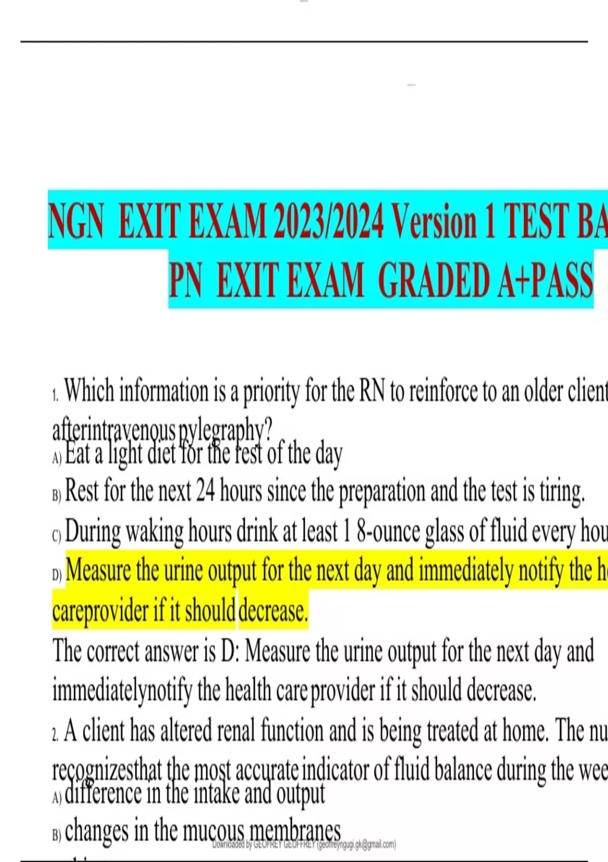 NGN EXIT EXAM 2023/2024 Version 1 TEST BANK PN EXIT EXAM GRADED A+PASS 1.Which information is a priority for the RN to reinforce to an older client afterintravenous pylegraphy? A)Eat a light diet for the rest of the day B)Rest for the next 24 hours since the preparation and the test is tiring. C)During waking hours drink at least 1 8-ounce glass of fluid every hour for the next 2days D)Measure the urine output for the next day and immediately notify the health careprovider if it should decrease. The correct answer is D: Measure the urine output for the next day and immediatelynotify the health care provider if it should decrease. 2.A client has altered renal function and is being treated at home. The nurse recognizesthat the most accurate indicator of fluid balance during the weekly visits is A)difference in the intake and output B)changes in the mucous membranes C)skin turgor D)weekly weight The correct answer is D: weekly weight 3.A client has been diagnosed with Zollinger-Ellison syndrome.Which information ismost important for the nurse to reinforce with the client? A)It is a condition in which one or more tumors called gastrinomas form in the pancreasor in the upper part of the small intestine (duodenum) B)It is critical to report promptly to your health care provider any findings of pepticulcers c)Treatment consists of medications to reduce acid and heal any peptic ulcers and, ifpossible, surgery to remove any tumors D)With the average age at diagnosis at 50 years the peptic ulcers may occur at unusualareas of the stomach or intestine The correct answer is B: It is critical to report promptly to your health care provider anyfindings of peptic ulcers . 4.A primigravida in the third trimester is hospitalized for preeclampsia. The nurse determines that the client’s blood pressure is increasing. Which action should the nurse take first? A)Check the protein level in urine B)Have the client turn to the left side C)Take the temperature D)Monitor the urine output The correct answer is B: Have the client turn to the left side 5.The nurse is caring for a client in atrial fibrillation. The atrial heart rate is 250 and theventricular rate is controlled at 75. Which of the following findings is cause for the most concern? A)Diminished bowel sounds B)Loss of appetite C)A cold, pale lower leg D)Tachypnea The correct answer is C: A cold, pale lower leg 6.The client with infective endocarditis must be assessed frequently by the home healthnurse. Which finding suggests that antibiotic therapy is not effective, and must be reported by the nurse immediately to the healthcare provider? A)Nausea and vomiting B)Fever of 103 degrees Fahrenheit (39.5 degrees Celsius) C)Diffuse macular rash D)Muscle tenderness The correct answer is B: Fever of 103 degrees F (39.5 degrees C)