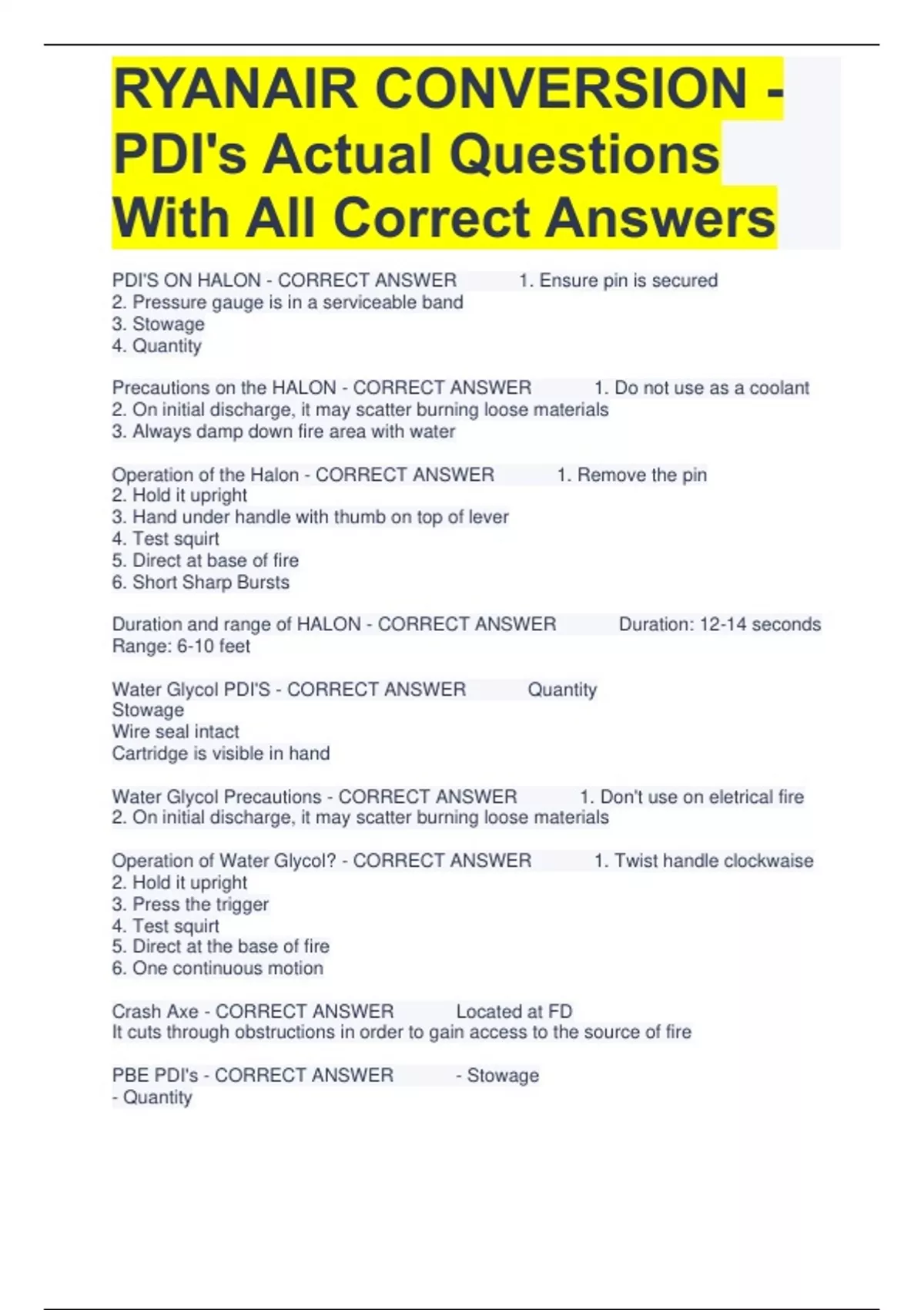 RYANAIR CONVERSION - PDI's Actual Questions With All Correct Answers PDI'S ON HALON - CORRECT ANSWER 1. Ensure pin is secured 2. Pressure gauge is in a serviceable band 3. Stowage 4. Quantity Precautions on the HALON - CORRECT ANSWER 1. Do not use as a coolant 2. On initial discharge, it may scatter burning loose materials 3. Always damp down fire area with water Operation of the Halon - CORRECT ANSWER 1. Remove the pin 2. Hold it upright 3. Hand under handle with thumb on top of lever 4. Test squirt 5. Direct at base of fire 6. Short Sharp Bursts Duration and range of HALON - CORRECT ANSWER Duration: 12-14 seconds Range: 6-10 feet Water Glycol PDI'S - CORRECT ANSWER Quantity Stowage Wire seal intact Cartridge is visible in hand Water Glycol Precautions - CORRECT ANSWER 1. Don't use on eletrical fire 2. On initial discharge, it may scatter burning loose materials Operation of Water Glycol? - CORRECT ANSWER 1. Twist handle clockwaise 2. Hold it upright 3. Press the trigger 4. Test squirt 5. Direct at the base of fire 6. One continuous motion Crash Axe - CORRECT ANSWER Located at FD It cuts through obstructions in order to gain access to the source of fire PBE PDI's - CORRECT ANSWER - Stowage - Quantity - Check green storage case is intact - Indicator colour is blue PBE Precautions - CORRECT ANSWER 1. Don't touch the life support pack because it will be really hot 2. Careful with sharp earrings and accessories