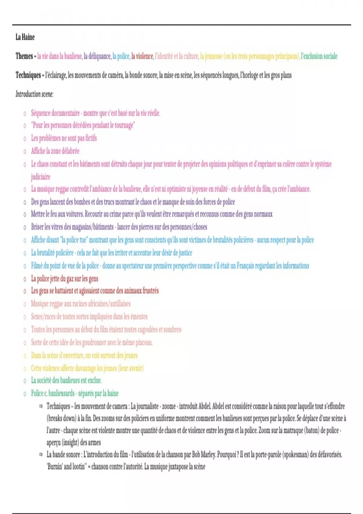 A-Level Edexcel French La Haine notes. Sorted by scene, with notes on each scene sorted by theme. Also covers basic notes on characters and notes on techniques used by Kassovitz. Notes in French with some hard vocab translated into English