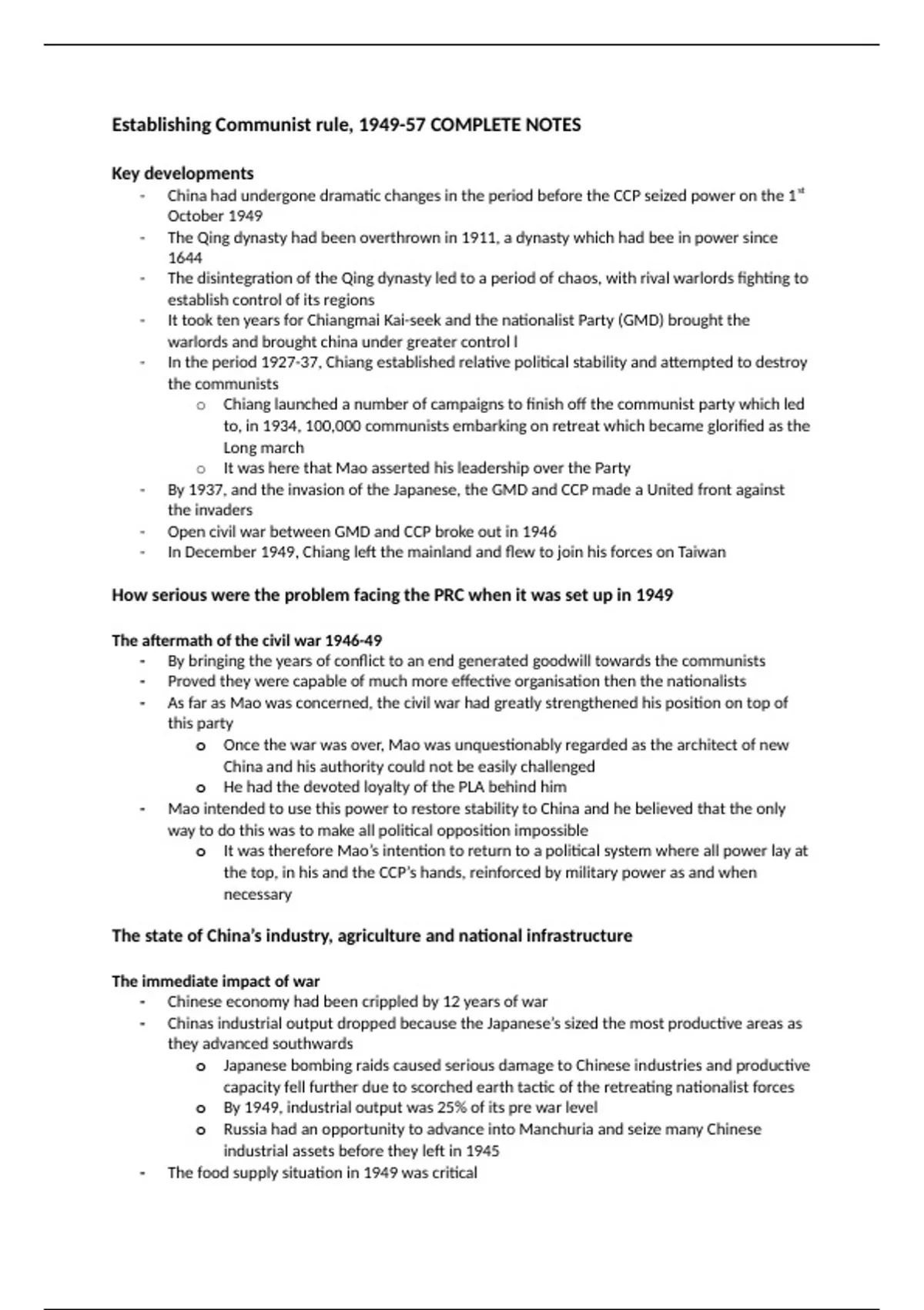 This document provides a full summary of the chapter Establishing Communist rule 1949-57. It goes into depth into how the CCP took control, measures to ensure conformity and China’s intervention into the Korean War. I used these notes in my mocks to get an A* predicted and have a place at Oxford for history
