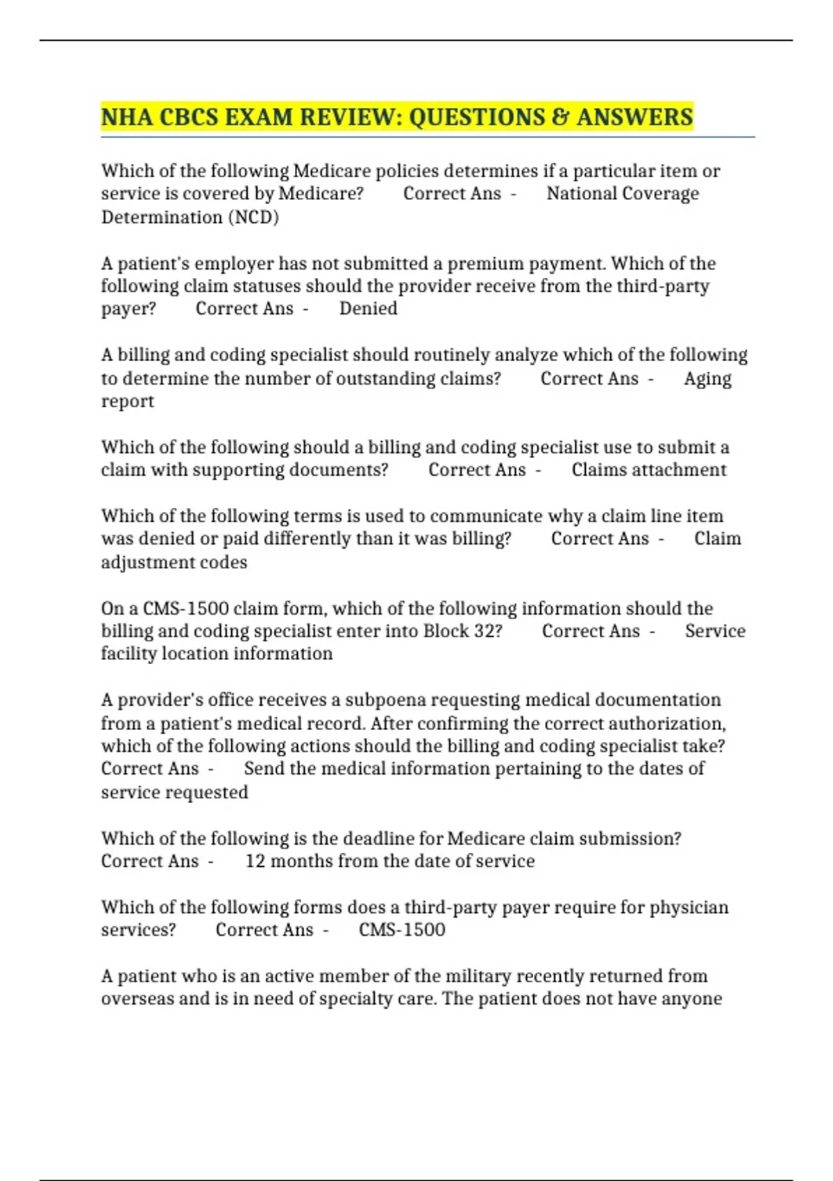 NHA CBCS EXAM REVIEW: QUESTIONS & ANSWERS