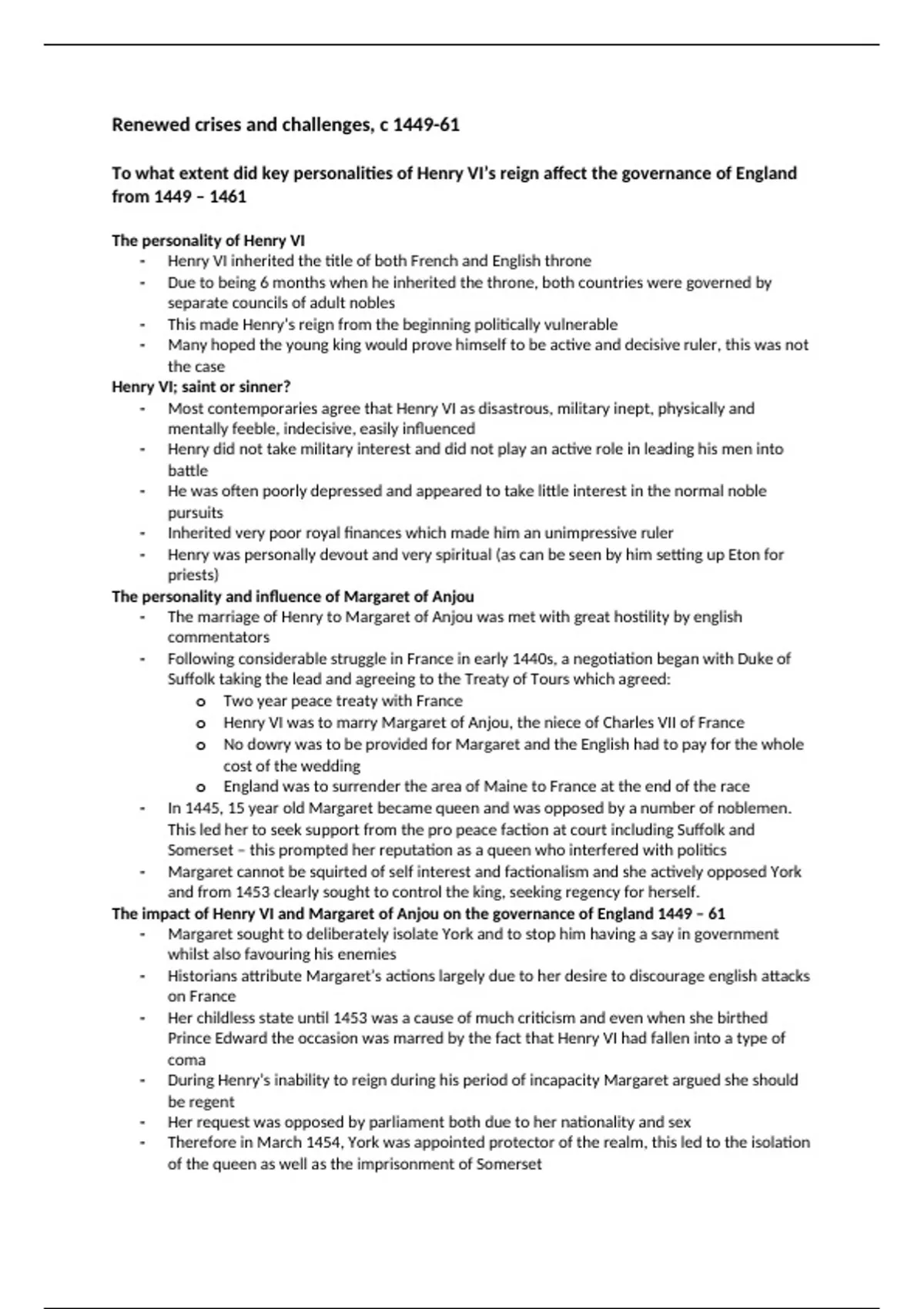 This document provides a full summary of the chapter of Renewed crisis and Challenges 1449-61. This is the breadth topic in Lancastrians and Yorkists option 30 Edexcel A level history. I used these notes in my mocks to get an A* predicted and have a place at Oxford for history