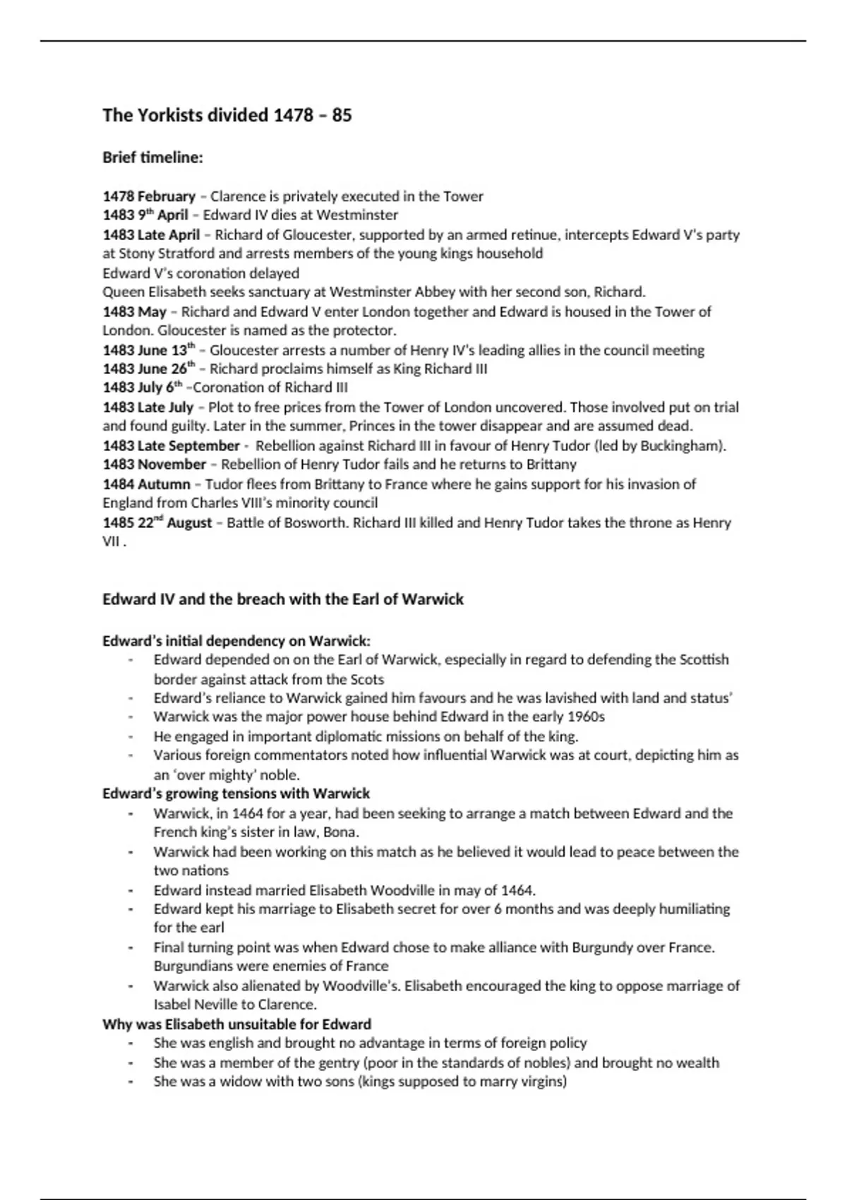 This document provides a full summary of the chapter of the Yorkists divided 1971-83. This is the depth topic in Lancastrians and Yorkists option 30 Edexcel A level history. I used these notes in my mocks to get an A* predicted and have a place at Oxford for history