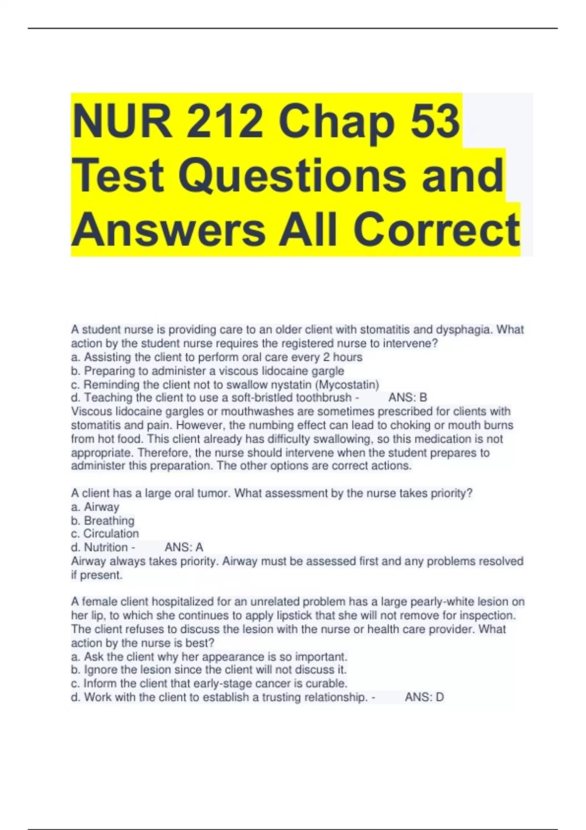 NUR 212 Chap 53 Test Questions and Answers All Correct A student nurse is providing care to an older client with stomatitis and dysphagia. What action by the student nurse requires the registered nurse to intervene? a. Assisting the client to perform oral care every 2 hours b. Preparing to administer a viscous lidocaine gargle c. Reminding the client not to swallow nystatin (Mycostatin) d. Teaching the client to use a soft-bristled toothbrush - ANS: B Viscous lidocaine gargles or mouthwashes are sometimes prescribed for clients with stomatitis and pain. However, the numbing effect can lead to choking or mouth burns from hot food. This client already has difficulty swallowing, so this medication is not appropriate. Therefore, the nurse should intervene when the student prepares to administer this preparation. The other options are correct actions. A client has a large oral tumor. What assessment by the nurse takes priority? a. Airway b. Breathing c. Circulation d. Nutrition - ANS: A Airway always takes priority. Airway must be assessed first and any problems resolved if present. A female client hospitalized for an unrelated problem has a large pearly-white lesion on her lip, to which she continues to apply lipstick that she will not remove for inspection. The client refuses to discuss the lesion with the nurse or health care provider. What action by the nurse is best? a. Ask the client why her appearance is so important. b. Ignore the lesion since the client will not discuss it. c. Inform the client that early-stage cancer is curable. d. Work with the client to establish a trusting relationship. - ANS: D Clients with oral cancers often have body image difficulties due to the location of the tumor or the results of surgical treatment. This client appears to be using denial to cope with this problem. The nurse should work to establish a helping-trusting relationship in hopes that the client will be amenable to future discussions about the lesion. Asking "why" questions often puts people on the defensive and should be avoided. Ignoring the lesion is not being an advocate for the client. Education is important, but right now the client is in denial, so this information will not seem relevant to her.