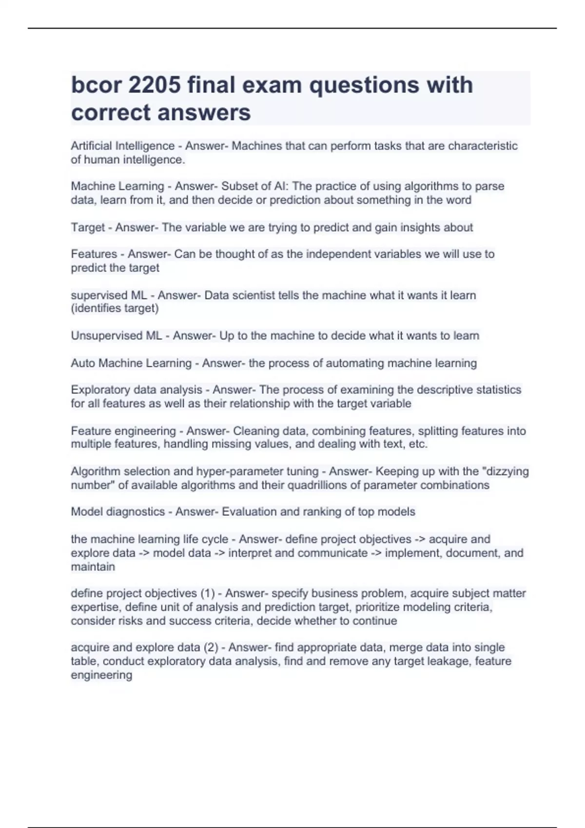 Artificial Intelligence - Answer- Machines that can perform tasks that are characteristic of human intelligence. Machine Learning - Answer- Subset of AI: The practice of using algorithms to parse data, learn from it, and then decide or prediction about something in the word Target - Answer- The variable we are trying to predict and gain insights about Features - Answer- Can be thought of as the independent variables we will use to predict the target supervised ML - Answer- Data scientist tells the machine what it wants it learn (identifies target) Unsupervised ML - Answer- Up to the machine to decide what it wants to learn Auto Machine Learning - Answer- the process of automating machine learning Exploratory data analysis - Answer- The process of examining the descriptive statistics for all features as well as their relationship with the target variable Feature engineering - Answer- Cleaning data, combining features, splitting features into multiple features, handling missing values, and dealing with text, etc. Algorithm selection and hyper-parameter tuning - Answer- Keeping up with the "dizzying number" of available algorithms and their quadrillions of parameter combinations Model diagnostics - Answer- Evaluation and ranking of top models the machine learning life cycle - Answer- define project objectives - acquire and explore data - model data - interpret and communicate - implement, document, and maintain define project objectives (1) - Answer- specify business problem, acquire subject matter expertise, define unit of analysis and prediction target, prioritize modeling criteria, consider risks and success criteria, decide whether to continue acquire and explore data (2) - Answer- find appropriate data, merge data into single table, conduct exploratory data analysis, find and remove any target leakage, feature engineering model data (3) - Answer- variable selection, build candidate models, model validation and selection interpret and communicate (4) - Answer- interpret model, communicate model insights implement, document, and maintain (5) - Answer- set up batch or AP prediction system, document modeling process for reproducibility, create model monitoring and maintenance plan ·8 criteria of auto ML Excellence: - Answer- o Accuracy o Productivity o Ease of use o Understanding and learning o Resource availability o Process transparency: effects understanding and learning o Generalizability across contexts o Recommended actions Feature Name - Answer- directly from Flat File Index - Answer- common way to talk about feature (i.e. feature #34) green bars - Answer- -indicated the relative importance of a particular feature when examined against the target independently of all other features. Var Type - Answer- Boolean, Categorical, Numeric, Text --Check that they match your expectations Unique - Answer- Number of unique values Missing - Answer- Number of missing values Descriptive Stats - Answer- Mean, Stddev, Median, Min, Max (Where applicable) ACE Scores - Answer- alternating conditional expectations, Very loosely a correlation for non-linear Boolean Variables - Answer- True or yes = 1 and false or no = 0 (binary) Text Variable - Answer- a specific diagnosis and how many times we see it Training Set - Answer- a subsection of a dataset from which the machine learning algorithm uncovers or "learns" relationships between the features and the target variable.