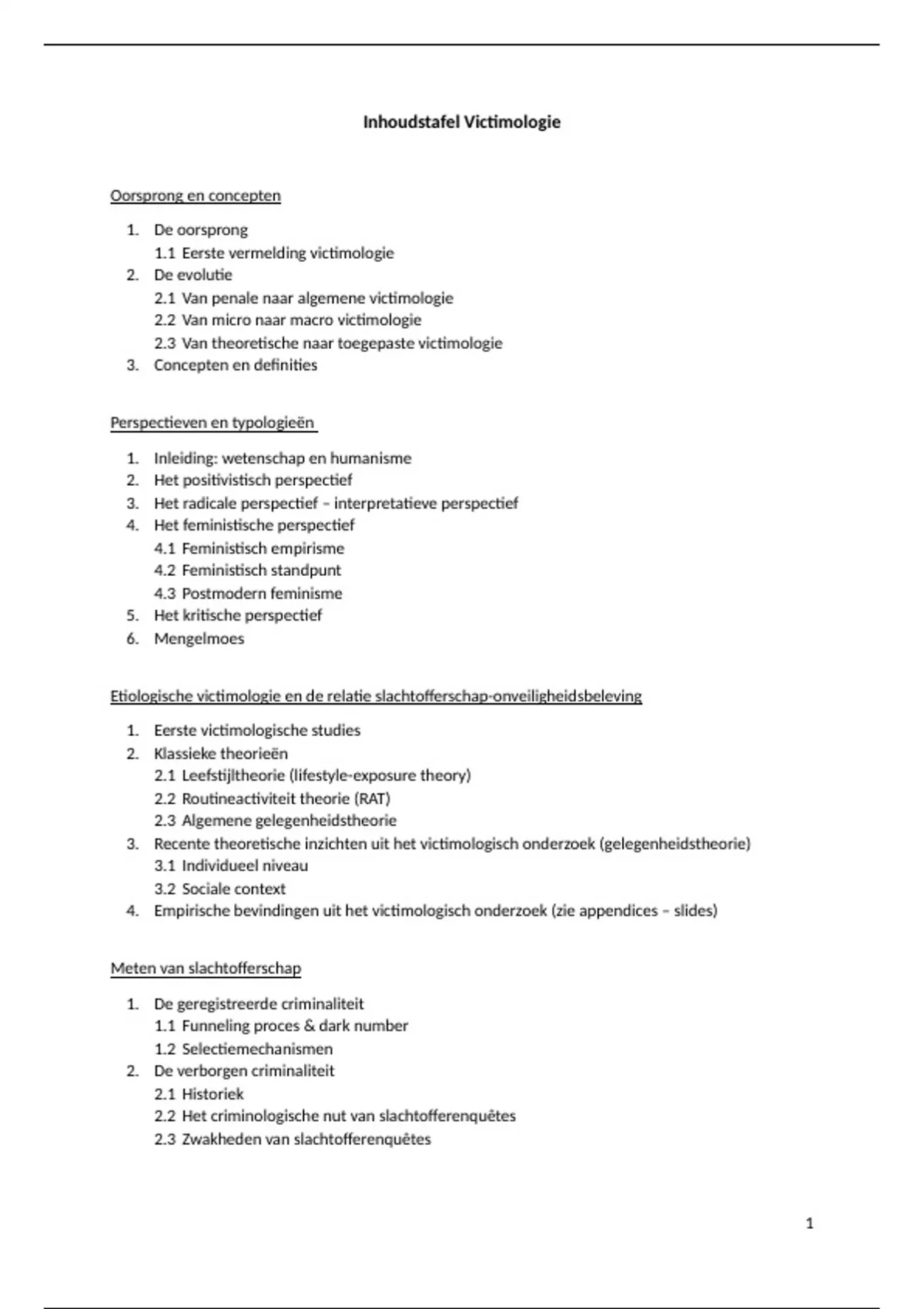 Inhoudstafel van het vak victimologie, handig tijdens het studeren