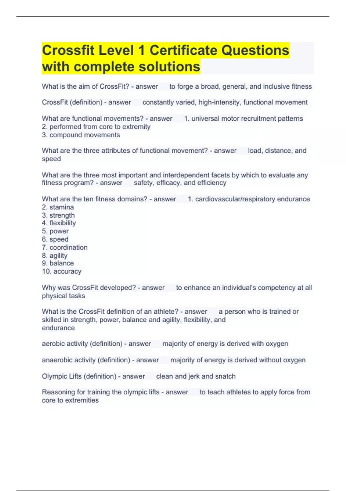 Crossfit Level 1 Certificate Questions with complete solutions What is the aim of CrossFit? to forge a broad, general, and inclusive fitness CrossFit (definition) constantly varied, high-intensity, functional movement What are functional movements? 1. universal motor recruitment patterns 2. performed from core to extremity 3. compound movements What are the three attributes of functional movement? load, distance, and speed What are the three most important and interdependent facets by which to evaluate any fitness program? safety, efficacy, and efficiency What are the ten fitness domains? 1. cardiovascular/respiratory endurance 2. stamina 3. strength 4. flexibility 5. power 6. speed 7. coordination 8. agility 9. balance 10. accuracy Why was CrossFit developed? to enhance an individual's competency at all physical tasks What is the CrossFit definition of an athlete? a person who is trained or skilled in strength, power, balance and agility, flexibility, and endurance aerobic activity (definition) majority of energy is derived with oxygen anaerobic activity (definition) majority of energy is derived without oxygen Olympic Lifts (definition) clean and jerk and snatch Reasoning for training the olympic lifts to teach athletes to apply force from core to extremities Neuroendocrine adaptation (definition) a change in the body that affects you either neurologically or hormonally Gymnastics (definition) rely on body weight as the sole source of resistance Cross training (definition) exceeding the normal parameters of the regular demands of your sport or training Why are functional movements important? functional movements are mechanically sound and therefore safe, and secondly they are the movements that elicit a high neuroendocrine response CrossFit dietary prescription • Protein should be lean and varied and account for about 30% of your total caloric load. • Carbohydrates should be predominantly low- glycemic and account for about 40% of your total caloric load. • Fat should be from whole food sources and account for about 30% of your total caloric load Caloric intake prescription Total calories should be based on protein needs, which should be set at between 0.7 and 1.0 grams of protein per pound of lean body mass (depending on your activity level). The 0.7 figure is for moderate daily workout loads and the 1.0 figure is for the hardcore athlete. What should I eat? Base your diet on garden vegetables, especially greens, meats, nuts and seeds, some fruit, little starch, and no sugar World Class Fitness in 100 Words Eat meat and vegetables, nuts and seeds, some fruit, little starch, and no sugar. Keep intake to levels that will support exercise but not body fat. Practice and train major lifts: Deadlift, clean, squat, presses, clean and jerk, and snatch. Similarly, master the basics of gymnastics: pullups, dips, rope climb, push-ups, sit-ups, presses to handstand, pirouettes, flips, splits, and holds. Bike, run, swim, row, etc., hard and fast. Five or six days per week mix these elements in as many combinations and patterns as creativity will allow. Routine is the enemy. Keep workouts short and intense. Regularly learn and play new sports CrossFit's first fitness model (description) the 10 physical skills cardiovascular/respiratory endurance ability of body systems to gather, process, and deliver oxygen. stamina ability of body systems to process, deliver, store, and utilize energy strength ability of a muscular unit, or combination of muscular units, to apply force flexibility ability to maximize the range of motion at a given joint power ability of a muscular unit, or combination of muscular units, to apply maximum force in minimum time speed ability to minimize the time cycle of a repeated movement coordination ability to combine several distinct movement patterns into a singular distinct movement agility ability to minimize transition time from one movement pattern to another balance ability to control the placement of the body's center of gravity in relation to its support base accuracy ability to control movement in a given direction or at a given intensity Training (definition) activity that improves performance through a measurable organic change in the body. Improvements in endurance, stamina, strength, and flexibility come about through training. Practice (definition) activity that improves performance through changes in the nervous system. Improvements in coordination, agility, balance, and accuracy come about through practice. Adaptations of both training and practice power and speed CrossFit's second fitness model the Hopper The Hopper Model (description) This model suggests that your fitness can be measured by your capacity to perform well at given tasks in relation to other individuals. CrossFit's third fitness model The metabolic pathways phosphagen (phosphocreatine) pathway 10 seconds or less anaerobic maximum effort glycolytic (lactate) pathway Up to about 2 minutes anaerobic medium to high intensity oxidative (aerobic) pathway 2+ minutes aerobic low intensity CrossFit's fourth fitness model Sickness-wellness-fitness-continuum Interval Training (definition) mixes bouts of work and rest in timed intervals Tabata Interval 20 seconds of work followed by 10 seconds of rest repeated eight times Three waves of adaptation to endurance training 1. increased maximal oxygen consumption 2. increased lactate threshold 3. increased efficiency Zone Diet CrossFit's preferred nutrition program CrossFit Workout Patterning Three days on, one off warm up 3-5 sets and 3-5 reps of a fundamental lift 10 minute gymnastics circuit 2-10 minute metcon Scalability and Applicability The needs of an Olympic athlete and our grandparents differ by degree not kind. One is looking for functional dominance, the other for functional competence. We scale load and intensity; we do not change programs. Fitness (definition) work capacity across broad time and modal domains efficacy What is the return? efficie